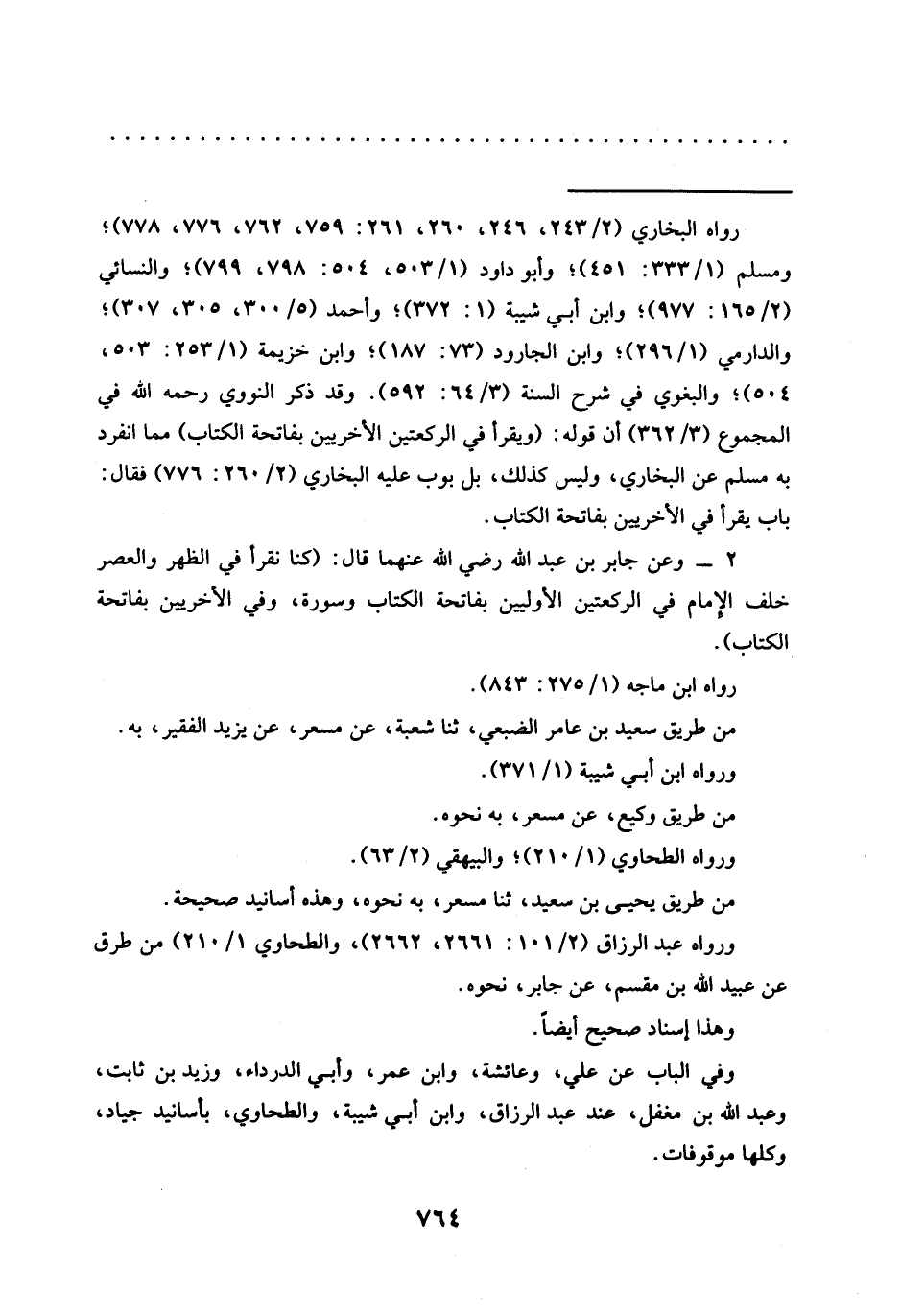 = رواه البخاري (2/ 243، 246، 260، 261: 759، 762، 776، 778)؛ ومسلم (1/ 333: 451)؛ وأبو داود (1/ 503، 504: 798، 799)؛ والنسائي (2/ 165: 977)؛ وابن أبي شيبة (1: 372)؛ وأحمد (5/ 300، 305، 307)؛ والدارمي (1/ 296)؛ وابن الجارود (73: 187)؛ وابن خزيمة (1/ 253: 503، 504)؛ والبغوي في شرح السنة (3/ 64: 592). وقد ذكر النووي رحمه الله في المجموع (3/ 362) أن قوله: (ويقرأ في الركعتين الأخريين بفاتحة الكتاب) مما انفرد به مسلم عن البخاري، وليس كذلك، بل بوب عليه البخاري (2/ 260: 776) فقال: باب يقرأ في الأخريين بفاتحة الكتاب.