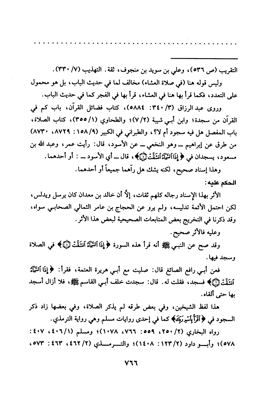 وروى عبد الرزاق (3/ 340: 5884)، كتاب فضائل القرآن، باب كم في القرآن من سجدة؛ وابن أبي شيبة (2/ 7)؛ والطحاوي (1/ 355)، كتاب الصلاة، باب المفصل هل فيه سجود أم لا؟، والطبراني في الكبير (9/ 158: 8729، 8730) من طرق عن إبراهيم -وهو النخعي- عن الأسود، قال: رأيت عمر، وعبد الله بن مسعود، يسجدان في {إِذَا السَّمَاءُ انْشَقَّتْ (1)}، قال -أي الأسود-: أو أحدهما. وهذا إسناد صحيح، لكنه يشك هل رآهما جميعًا أو أحدهما.