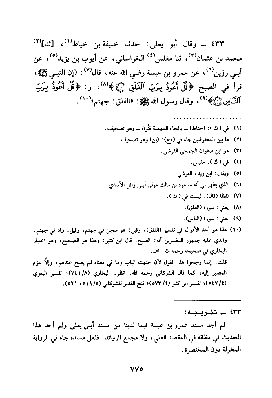 433 - وَقَالَ أَبُو يَعْلَى حَدَّثَنَا خَلِيفَةُ بْنُ خَيَّاطٍ ثنا مُحَمَّدُ بْنُ عُثْمَانَ ثنا مُغَلِّسٌ الْخُرَاسَانِيُّ عَنْ أَيُّوبَ بْنِ يَزِيدَ عَنْ أَبِي رَزِينٍ عَنْ عَمْرِو بْنِ عَبَسَةَ رَضِيَ اللَّهُ عَنْهُ قال (إنَّ النَّبِيَّ صَلَّى اللَّهُ عَلَيْهِ وَسَلَّمَ §قَرَأَ فِي الصُّبْحِ {قُلْ أَعُوذُ برب الفلق} و {قل أَعُوذُ بِرَبِّ النَّاسِ} وَقَالَ رَسُولُ اللَّهِ صَلَّى اللَّهُ عَلَيْهِ وَسَلَّمَ الْفَلَقُ جَهَنَّمُ