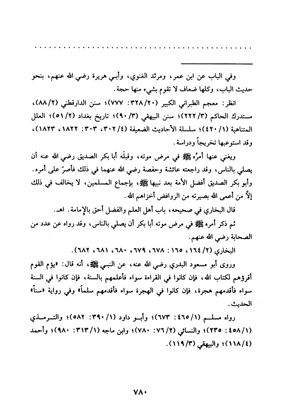 وروى أبو مسعود البدري رضي الله عنه، عَنِ النَّبِيِّ -صَلَّى اللَّهُ عَلَيْهِ وَسَلَّمَ-، أَنَّهُ قال: "يؤم القوم أقرؤهم لكتاب الله، فإن كانوا في القراءة سواء فأعلمهم بالسنة، فإن كانوا في السنة سواء فأقدمهم هجرة، فإن كانوا في الهجرة سواء فأقدمهم سلمًا" وفي رواية "سنًا" الحديث.
