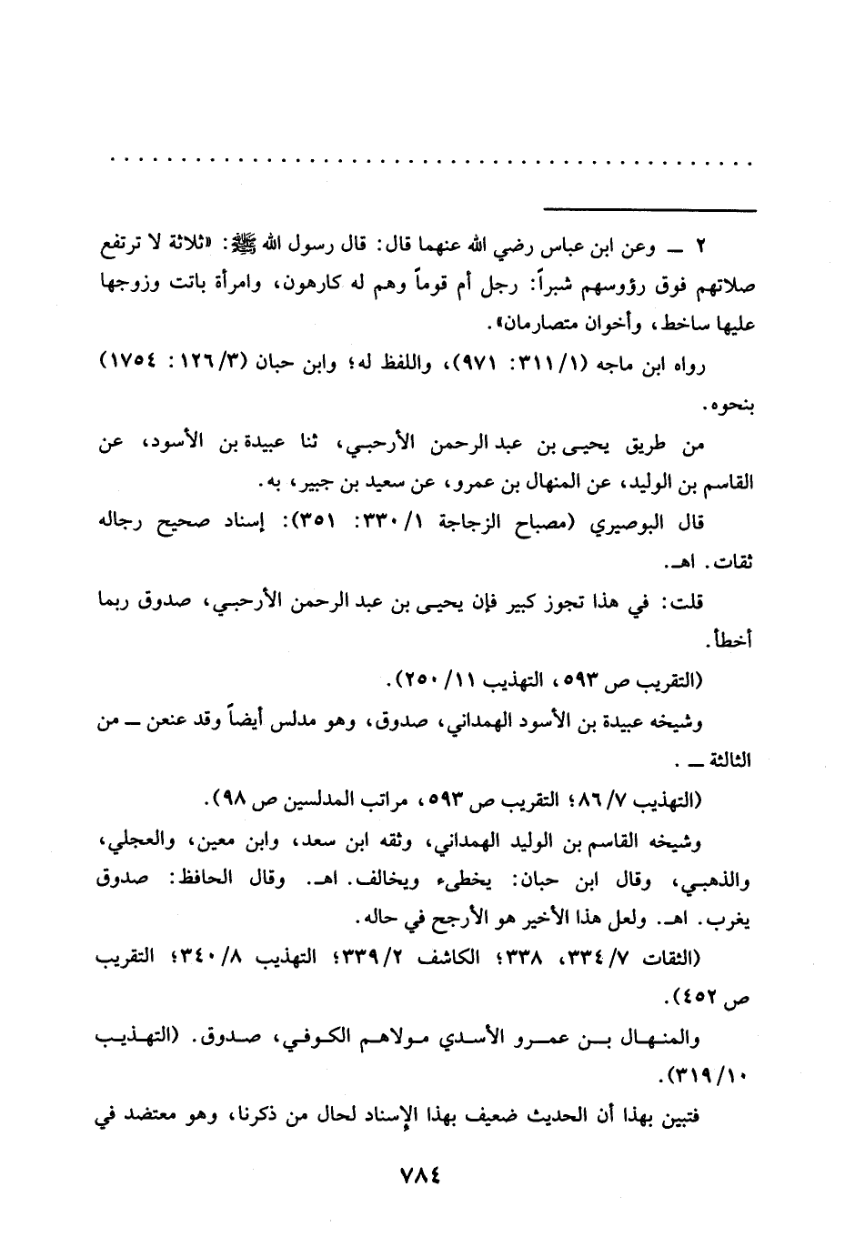 = 2 - وعن ابن عباس رضي الله عنهما قَالَ: قَالَ رَسُولُ اللَّهِ -صَلَّى اللَّهُ عَلَيْهِ وسلم-: (ثلاثة لا ترتفع صلاتهم فوق رؤوسهم شبرًا: رجل أم قومًا وهم له كارهون، وامرأة باتت وزوجها عليها ساخط، وأخوان متصارمان".