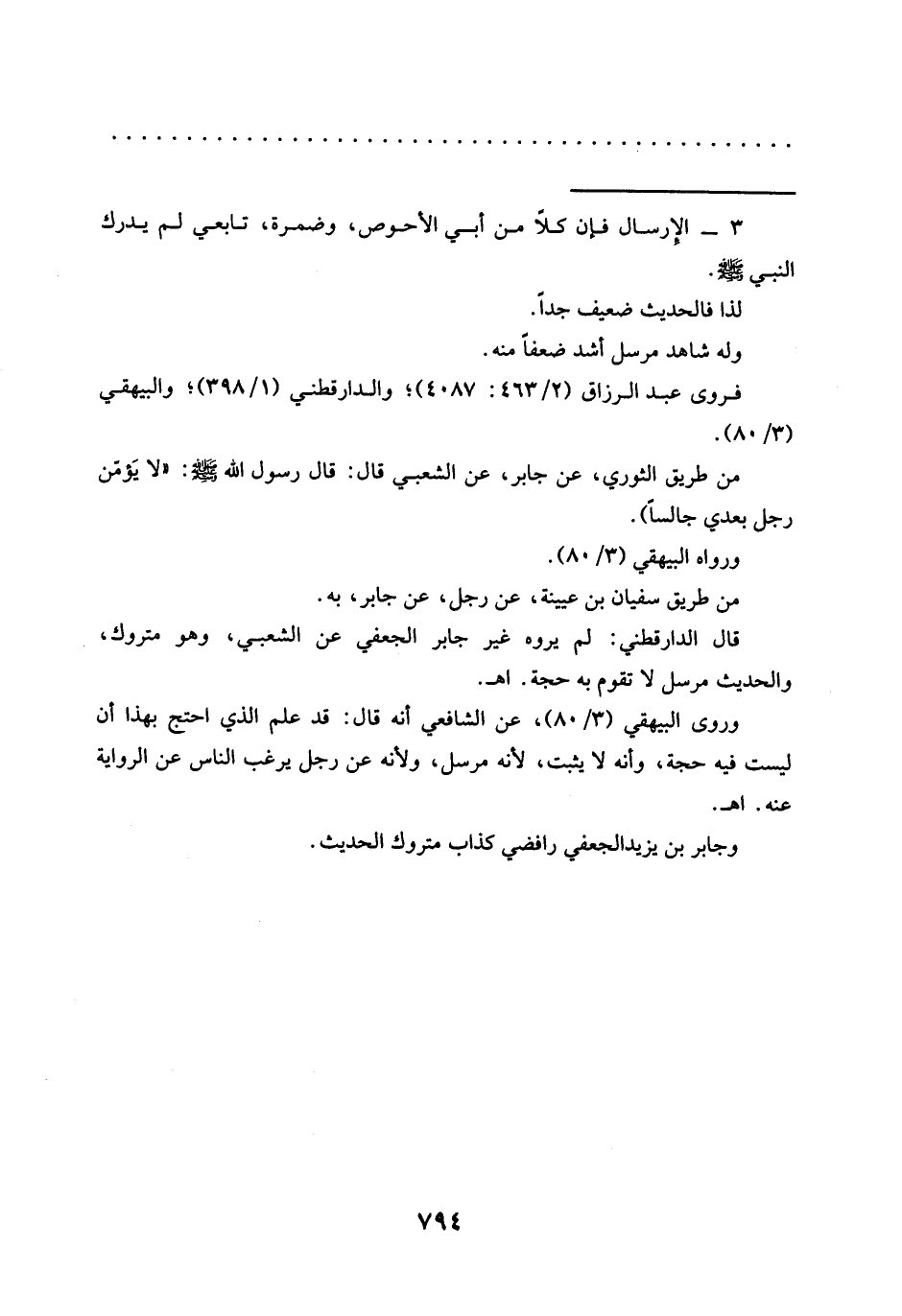 من طريق الثوري، عن جابر، عن الشعبي قَالَ: قَالَ رَسُولُ اللَّهِ -صَلَّى اللَّهُ عَلَيْهِ وسلم-: "لا يَؤمّن رجل بعدي جالسًا).