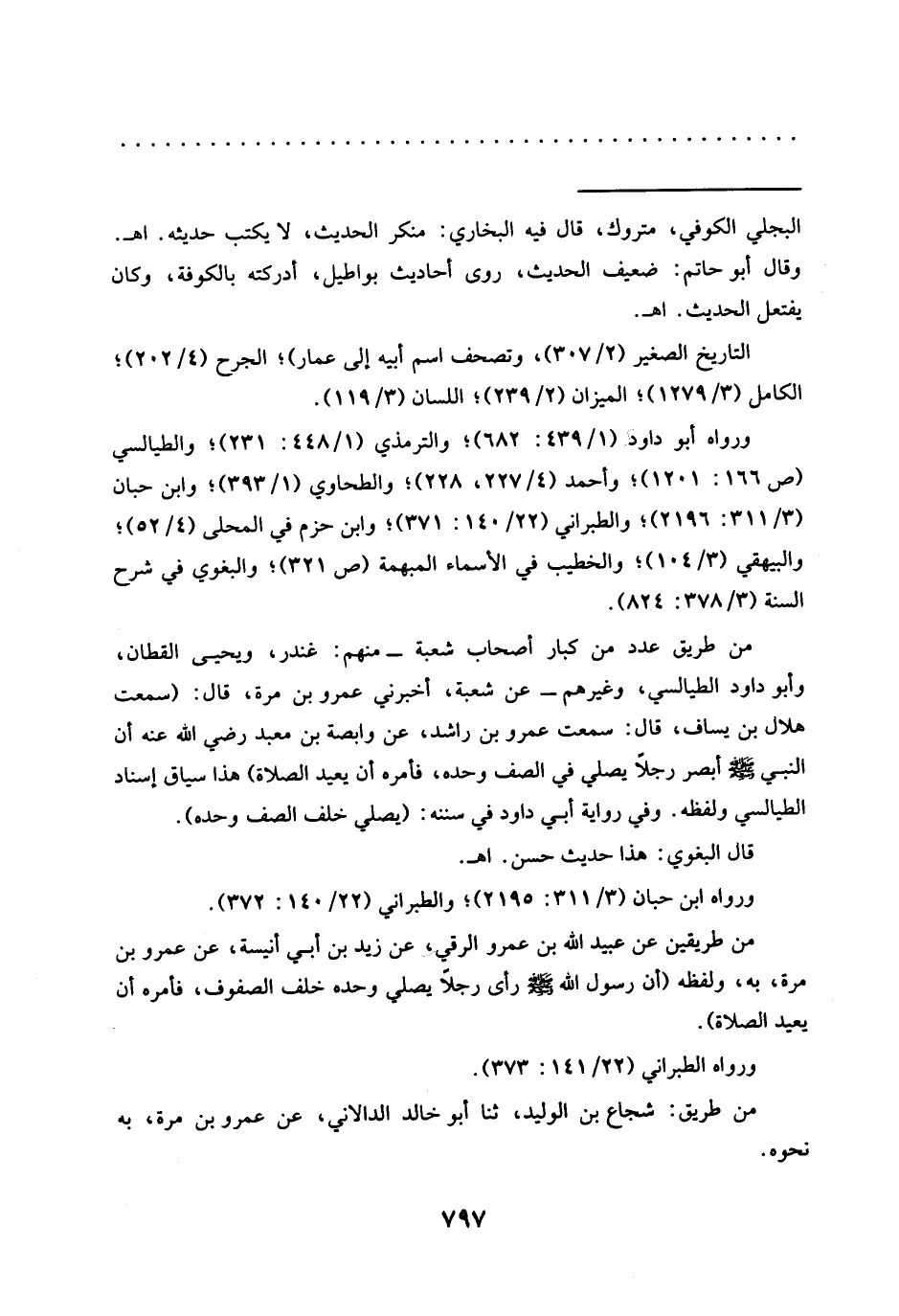 من طريق عدد من كبار أصحاب شعبة -منهم: غندر، ويحيى القطان، وأبو داود الطيالسي، وغيرهم- عن شعبة، أخبرني عمرو بن مرة، قال: (سمعت هلال بن يساف، قال: سمعت عمرو بن راشد، عن وابصة بن معبد رَضِيَ اللَّهُ عَنْهُ أَنَّ النَّبِيَّ -صَلَّى اللَّهُ عليه وسلم- أبصر رجلًا يصلي في الصف وحده، فأمره أن يعيد الصلاة) هذا سياق إسناد الطيالسي ولفظه. وفي رواية أبي داود في سننه: (يصلي خلف الصف وحده).
