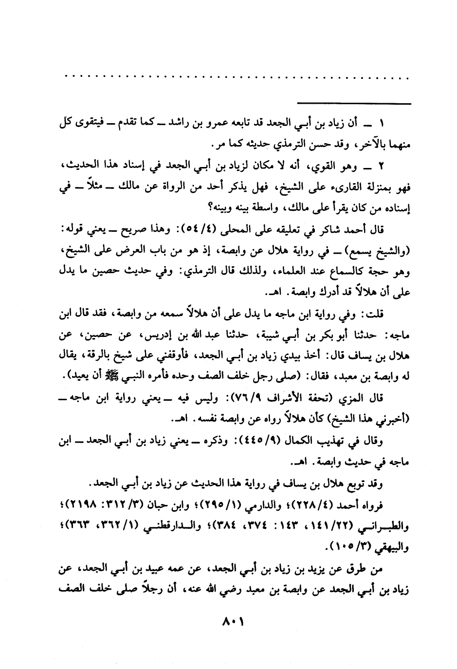 قلت: وفي رواية ابن ماجه ما يدل على أن هلالًا سمعه من وابصة، فقد قال ابن ماجه: حَدَّثَنَا أَبُو بَكْرِ بْنُ أَبِي شَيْبَةَ، حَدَّثَنَا عبد الله بن إدريس، عن حصين، عن هلال بن يساف قال: أخذ بيدي زياد بن أبي الجعد، فأوقفني على شيخ بالرقة، يقال له وابصة بن معبد، فقال: (صلى رجل خلف الصف وحده فَأَمَرَهُ النَّبِيُّ -صَلَّى اللَّهُ عَلَيْهِ وَسَلَّمَ- أَنْ يعيد).