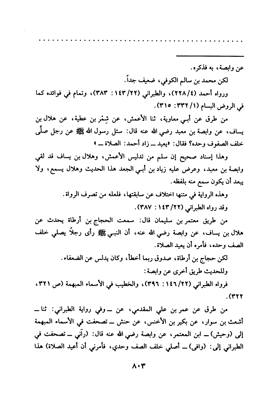 من طرق عن عمر بن علي المقدمي، عن -وفي رواية الطبراني: ثنا- أشعث بن سوار، عن بكير بن الأخنس، عن حنش -تصحفت في الأسماء المبهمة إلى (وحيش) - ابن المعتمر، عن وابصة رضي الله عنه قال: (رآني -تصحفت في الطبراني إلى: (وافى) - أصلي خلف الصف وحدي، فأمرني أن أعيد الصلاة) هذا=