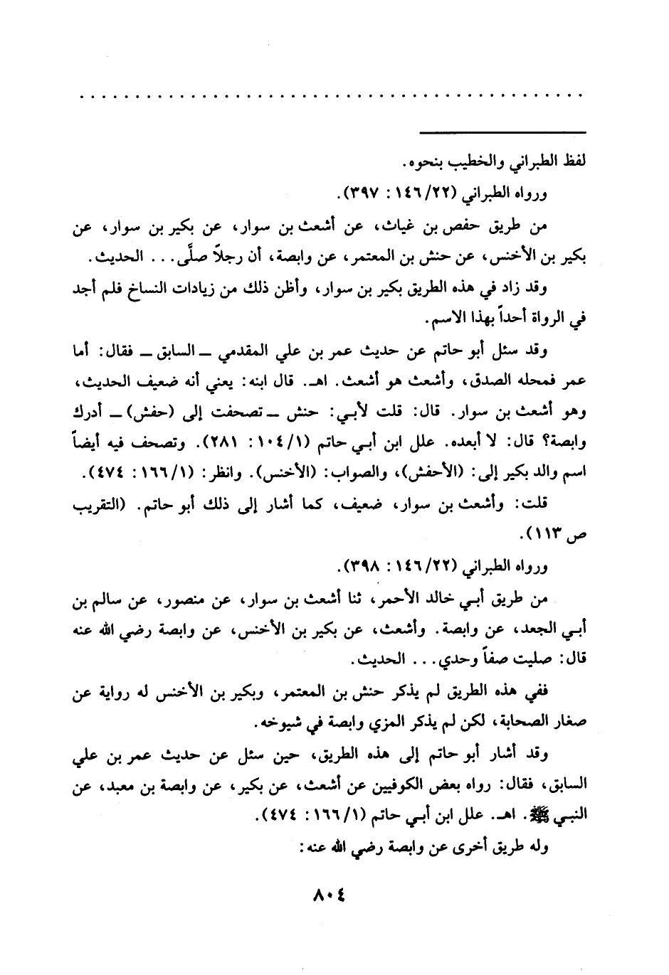 وهو أشعث بن سوار. قال: قلت لأبي: حنش -تصحفت إلى (حفش) - أدرك وابصة؟ قال: لا أبعده. علل ابن أبي حاتم (1/ 104: 281). وتصحف فيه أيضًا اسم والد بكير إلى: (الأحفش)، والصواب: (الأخنس). وانظر: (1/ 166: 474). قلت: وأشعث بن سوار، ضعيف، كما أشار إلى ذلك أبو حاتم. (التقريب ص 113).