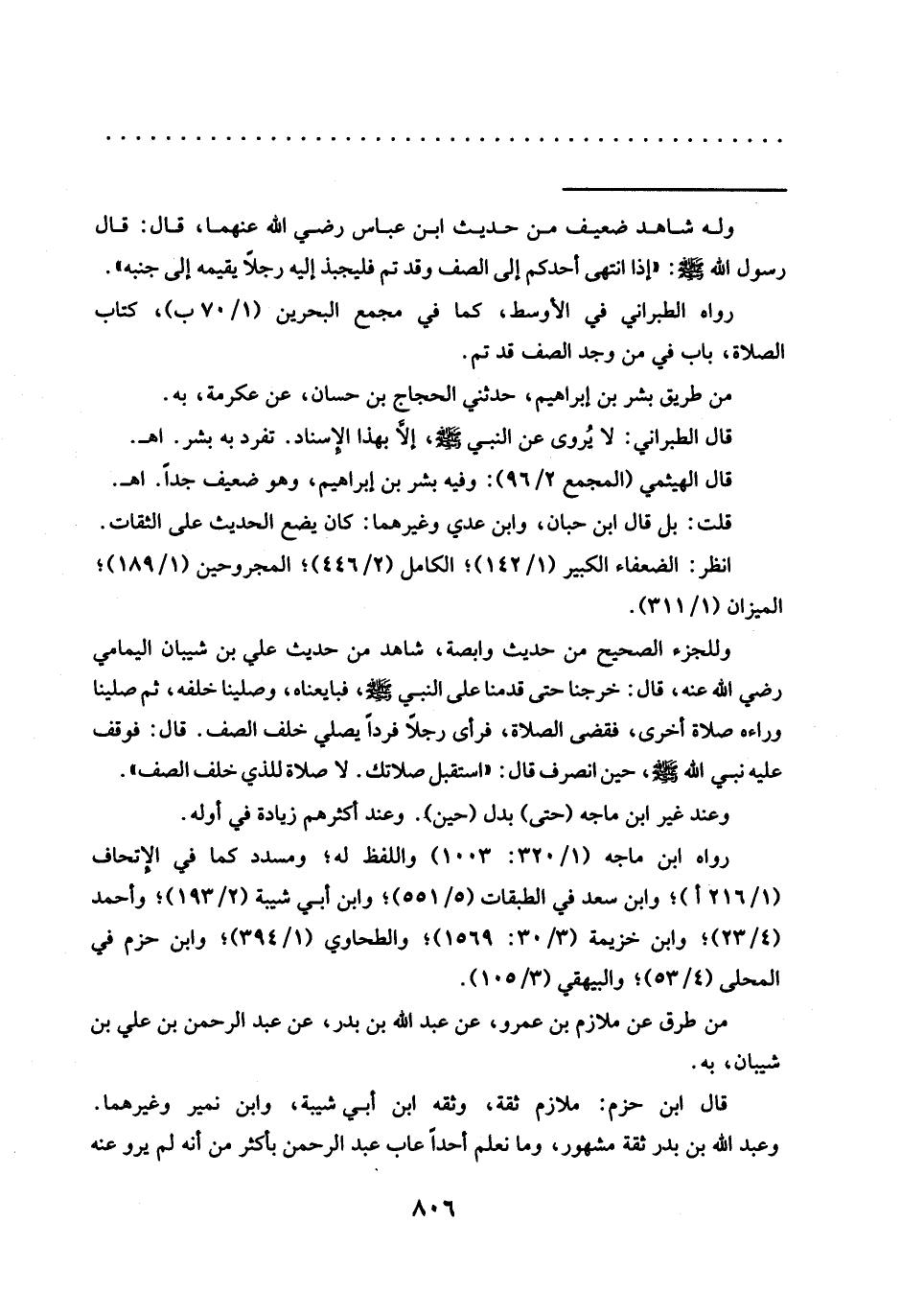 وللجزء الصحيح من حديث وابصة، شاهد من حديث علي بن شيبان اليمامي رضي الله عنه، قال: خرجنا حتى قدمنا على النبي -صلى الله عليه وسلم-، فبايعناه، وصلينا خلفه، ثم صلينا وراءه صلاة أخرى، فقضى الصلاة، فرأى رجلًا فردًا يصلي خلف الصف. قال: فوقف عليه نبي الله -صلى الله عليه وسلم-، حين انصرف قال: (استقبل صلاتك. لا صلاة للذي خلف الصف".