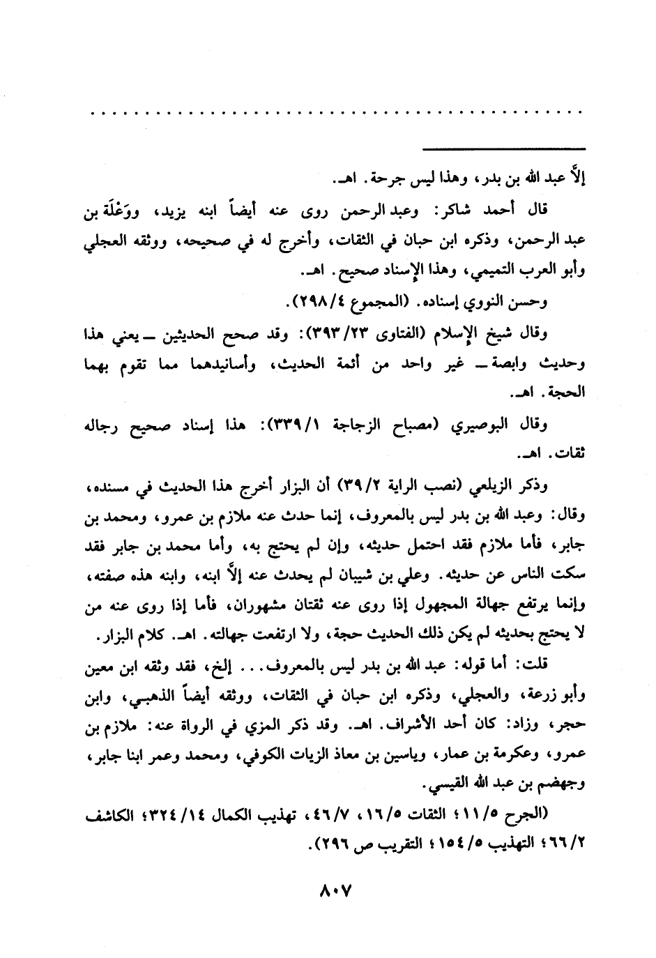 قلت: أما قوله: عبد الله بن بدر ليس بالمعروف ... إلخ، فقد وثقه ابن معين وأبو زرعة، والعجلي، وذكره ابن حبان في الثقات، ووثقه أيضًا الذهبي، وابن حجر، وزاد: كان أحد الأشراف. اهـ. وقد ذكر المزي في الرواة عنه: ملازم بن عمرو، وعكرمة بن عمار، وياسين بن معاذ الزيات الكوفي، ومحمد وعمر ابنا جابر، وجهضم بن عبد الله القيسي.