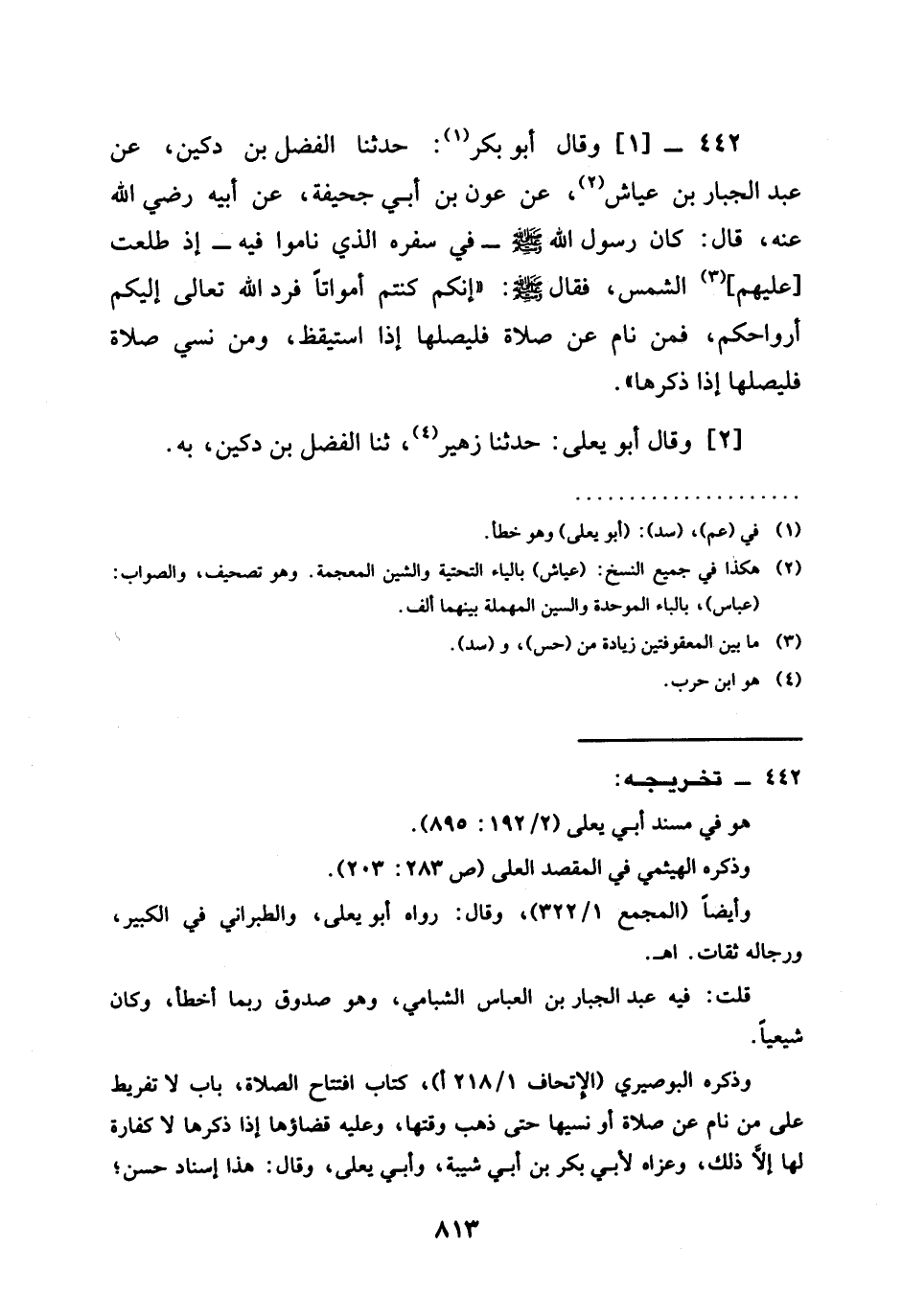 442 -[1] وَقَالَ أَبُو بَكْرٍ حَدَّثَنَا الْفَضْلُ بْنُ دُكَيْنٍ عَنْ عَبْدِ الْجَبَّارِ بْنِ عَيَّاشٍ عَنْ عَوْنِ بْنِ أَبِي جُحَيْفَةَ عَنْ أَبِيهِ رَضِيَ اللَّهُ عَنْهُ قَالَ كَانَ رَسُولُ اللَّهِ صَلَّى اللَّهُ عَلَيْهِ وَسَلَّمَ فِي سَفَرِهِ الَّذِي ناموا فيه إذا طَلَعَتْ عَلَيْهِمُ الشَّمْسُ فَقَالَ صَلَّى اللَّهُ عَلَيْهِ وَسَلَّمَ " §إِنَّكُمْ كُنْتُمْ أَمْوَاتًا فَرَدَّ اللَّهُ تَعَالَى إِلَيْكُمْ أَرْوَاحَكُمْ فَمَنْ نَامَ عَنْ صَلَاةٍ فَلْيُصَلِّهَا إِذَا اسْتَيقَظَ وَمَنْ نَسِيَ صَلَاةً فَلْيُصَلِّهَا إِذَا ذَكَرَهَا "