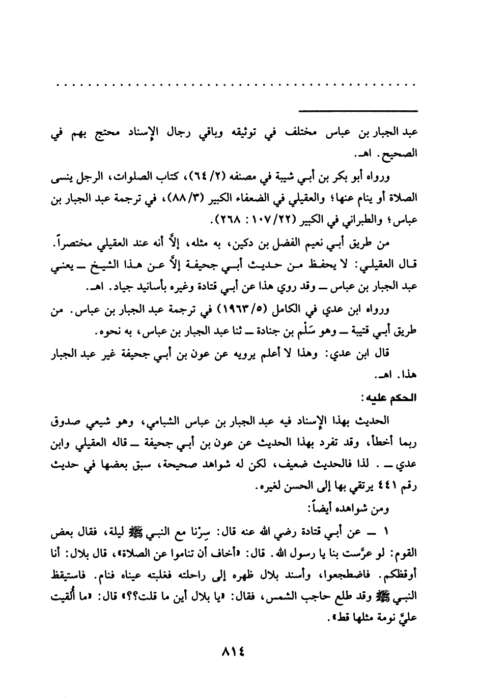 قال العقيلي: لا يحفظ من حديث أبي جحيفة إلَّا عن هذا الشيخ -يعني عبد الجبار بن عباس- وقد روي هذا عن أبي قتادة وغيره بأسانيد جياد. اهـ.