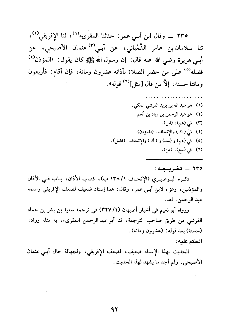 235 - وَقَالَ ابْنُ أَبِي عُمَرَ حَدَّثَنَا الْمُقْرِئُ ثنا الْإِفْرِيقِيُّ ثنا سَلَامَانُ بْنُ عَامِرٍ الشَّعْبَانِيُّ عَنْ أَبِي عُثْمَانَ الْأَصْبَحِيِّ عَنْ أَبِي هُرَيْرَةَ رَضِيَ اللَّهُ عَنْهُ قَالَ إنَّ رَسُولَ اللَّهِ صَلَّى اللَّهُ عَلَيْهِ وَسَلَّمَ كَانَ يَقُولُ " §الْمُؤَذِّنُ فَضْلُهُ عَلَى مَنْ حَضَرَ الصَّلَاةَ بِأَذَانِهِ عِشْرُونَ وَمِائَةٌ فَإِنْ أَقَامَ فَأَرْبَعُونَ وَمِائَتَا حَسَنَةٍ إِلَّا مَنْ قَالَ مِثْلَ قَوْلِهِ "