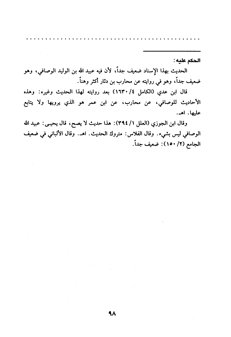 قال ابن عدي (الكامل 4/ 1630) بعد روايته لهذا الحديث وغيره: وهذه الأحاديث للوصافي، عن محارب، عن ابن عمر هو الذي يرويها ولا يتابع عليها. اهـ.