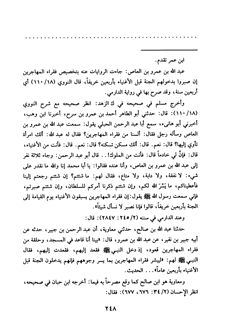 حدثنا عبد الله بن صالح، حدثني معاوية، أن عبد الرحمن بن جبير، حدثه عن أبيه جبير بن نفير، عن عبد الله بن عمرو، قال: "بينا أنا قاعد في المسجد، وحلقة من فقراء المهاجرين قعود، إذ دخل النبي -صلى الله عليه وسلم- فقعد إليهم، فقعدت إليهم، فقال النبي -صلى الله عليه وسلم- لهم: "ليبشر فقراء المهاجرين بما يسر وجوههم فإنهم يدخلون الجنة قبل الأغنياء بأربعين عامًا." ... الحديث.