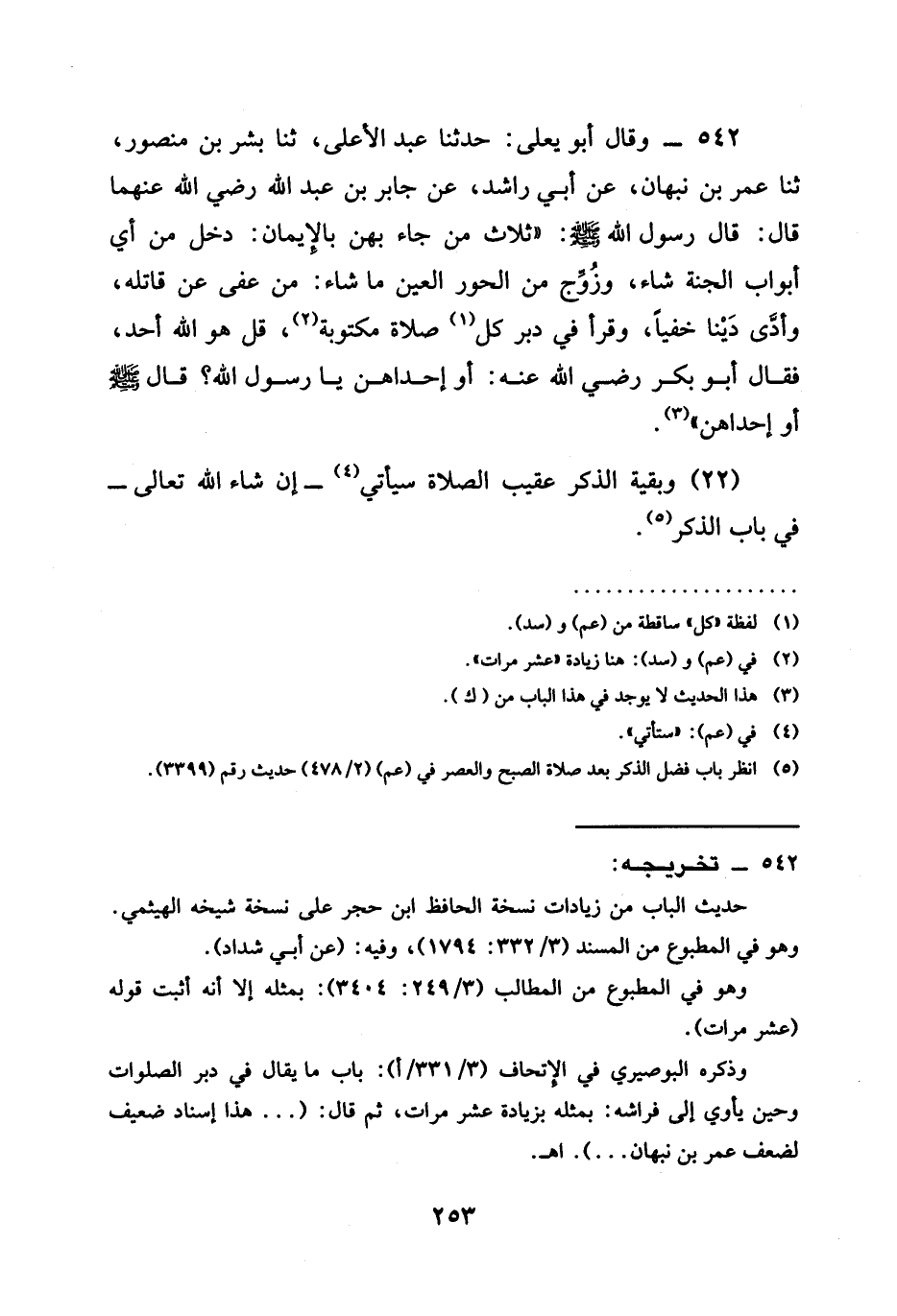 542 - وَقَالَ أَبُو يَعْلَي حَدَّثَنَا عَبْدُ الْأَعْلَى ثنا بِشْرُ بْنُ مَنْصُورٍ ثنا عُمَرُ بْنُ نَبْهَانَ عَنْ أَبِي رَاشِدٍ عَنْ جَابِرِ بْنِ عَبدِ اللَّهِ رَضِيَ اللَّهُ عَنْهُمَا قَالَ قَالَ رَسُولُ اللَّهِ صَلَّى اللَّهُ عَلَيْهِ وَسَلَّمَ " §ثَلَاثٌ مَنْ جَاءَ بِهِنَّ بِالْإِيمَانِ دَخَلَ مِنْ أَيِّ أَبْوَابِ الْجَنَّةِ شَاءَ وَزُوِّجَ مِنَ الْحُورِ الْعِينِ مَا شاء من عفى عَنْ قَاتِلِهِ وَأَدَّى دَيْنًا خَفِيًّا وَقَرَأَ فِي دُبُرِ كُلِّ صَلَاةٍ مَكْتُوبَةٍ قُلْ هُوَ اللَّهُ أَحَدٌ فَقَالَ أَبُو بَكْرٍ رَضِيَ اللَّهُ عَنْهُ أَوْ إِحْدَاهُنَّ يَا رَسُولَ اللَّهِ قَالَ صَلَّى اللَّهُ عَلَيْهِ وَسَلَّمَ أَوْ إِحْدَاهُنَّ