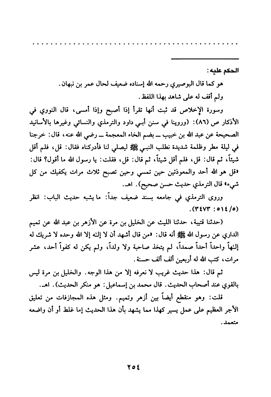 (حدثنا قتيبة، حدثنا الليث عن الخليل بن مرة عن الأزهر بن عبد الله عن تميم الداري عَنْ رَسُولِ اللَّهِ -صَلَّى اللَّهُ عَلَيْهِ وَسَلَّمَ- أنه قال: "من قال أشهد أن لاإله إلا الله وحده لاشريك له إلهًا واحدًا أحدًا صمدًا، لم يتخذ صاحبة ولا ولدًا، ولم يكن له كفوًا أحد، عشر مرات، كتب الله له أربعين ألف ألف حسنة.