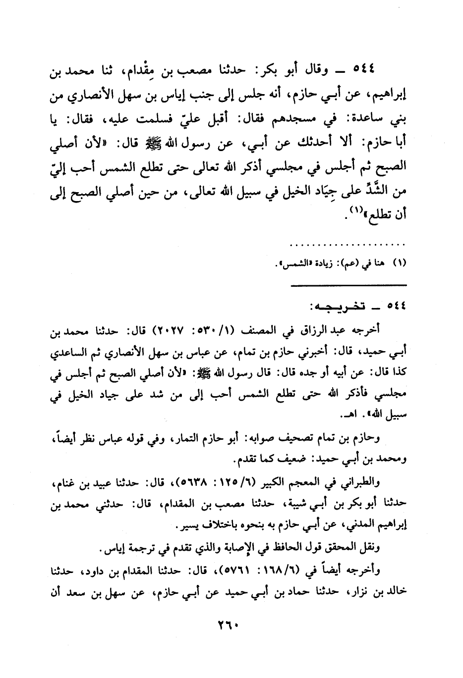 544 - وَقَالَ أَبُو بَكْرٍ حَدَّثَنَا مُصْعَبُ بْنُ مِقْدَامٍ ثنا مُحَمَّدُ بْنُ إِبْرَاهِيمَ عَنْ أَبِي حَازِمٍ أَنَّهُ جَلَسَ إِلَى جَنْبِ إِيَاسِ بْنِ سَهْلٍ الْأَنْصَارِيِّ مِنْ بَنِي سَاعِدَةَ: فِي مَسْجْدِهِمْ فَقَالَ: أَقْبِلْ عَلَيَّ فَسَلَّمْتُ عَلَيْهِ، فَقَالَ: يَا أَبَا حَازِمٍ أَلَا أُحَدِّثُكَ عَنْ أَبِي عَنْ رَسُولٍ اللَّهِ صَلَّى اللَّهُ عَلَيْهِ وَسَلَّمَ قَالَ §لَأَن أُصَلِّي الصَّبْحُ ثُمَّ أَجْلِسُ فِي مَجْلِسِي أَذْكُرُ اللَّهَ تَعَالَى حَتَّى تَطْلُعَ الشَّمْسُ أَحَبُّ إِلَيَّ مِنَ الشَّدِّ عَلَى جِيَادِ الْخَيْلِ فِي سَبِيلِ اللَّهِ تَعَالَى مِنْ حِينِ أُصَلِّى الصَّبْحُ إِلَى أَنْ تَطْلُعَ "