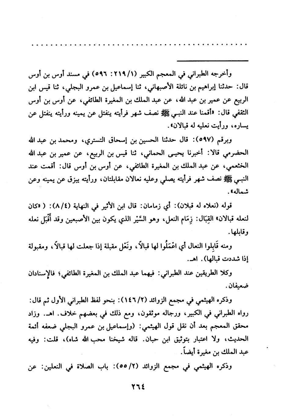 وبرقم (597): قال حدثنا الحسين بن إسحاق التستري، ومحمد بن عبد الله الحضرمي قالا: أخبرنا يحيى الحماني، ثنا قيس بن الربيع، عن عمير بن عبد الله الخثعمي، عَنْ عَبْدِ الْمَلِكِ بْنِ الْمُغِيرَةِ الطَّائِفِيِّ، عَنْ أوس بن أوس قال: أقمت عند النبي -صلى الله عليه وسلم- نصف شهر فرأيته يصلي وعليه نعالان مقابلتان، ورأيته يبزق عن يمينه وعن شماله".