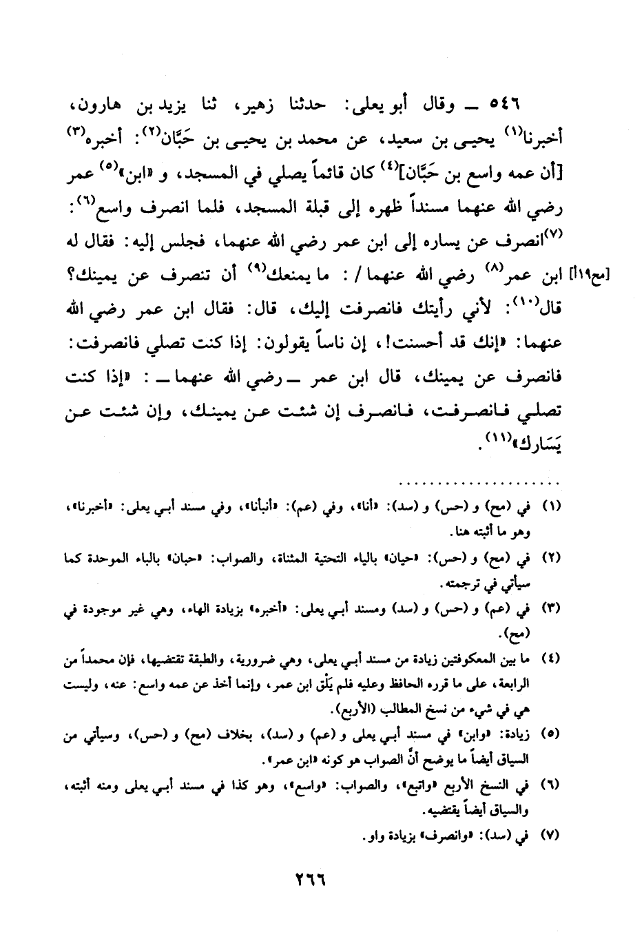 546 - وَقَالَ أَبُو يَعْلَى حَدَّثَنَا زُهَيْرٌ ثنا يَزِيدُ بن هارون أخبرنا يَحْيَى بْنُ سَعِيدٍ عَنْ مُحَمَّدِ بْنِ يَحْيَى بْنِ حَبَّانَ أخبره أن عمه واسع بن حبان كَانَ قَائِمًا يُصَلِّي فِي الْمَسْجِدِ وابن عُمَرَ رضي الله عنهما مسندا ظَهْرَهُ إِلَى قِبْلَةِ الْمَسْجِدِ فلما انصرف واسع انْصَرَفَ عَنْ يَسَارِهِ إِلَى ابْنِ عُمَرَ رَضِيَ اللَّهُ عَنْهُمَا فَجَلَسَ إِلَيْهِ فَقَالَ لَهُ ابْنُ عُمَرَ رَضِيَ اللَّهُ عَنْهُمَا §مَا يَمْنَعُكَ أَنْ تَنْصَرِفَ عَنْ يَمِينِكَ قَالَ لأني رأيتك فانصرفت إليك قَالَ فَقَالَ ابْنُ عُمَرَ رَضِيَ اللَّهُ عَنْهُمَا إِنَّكَ قَدْ أَحْسَنْتَ إِنَّ نَاسًا يَقُولُونَ إِذَا كُنْتَ تُصَلِّي فَانْصَرَفْتَ فَانْصَرِفْ عَنْ يَمِينِكَ قَالَ ابْنُ عُمَرَ رَضِيَ الله عنهما " إذا كُنْتَ تُصَلِّي فَانْصَرَفْتَ فَانْصَرِفْ إِنْ شِئْتَ عَنْ يَمِينِكَ وَإِنْ شِئْتَ عَنْ يَسَارِكَ "