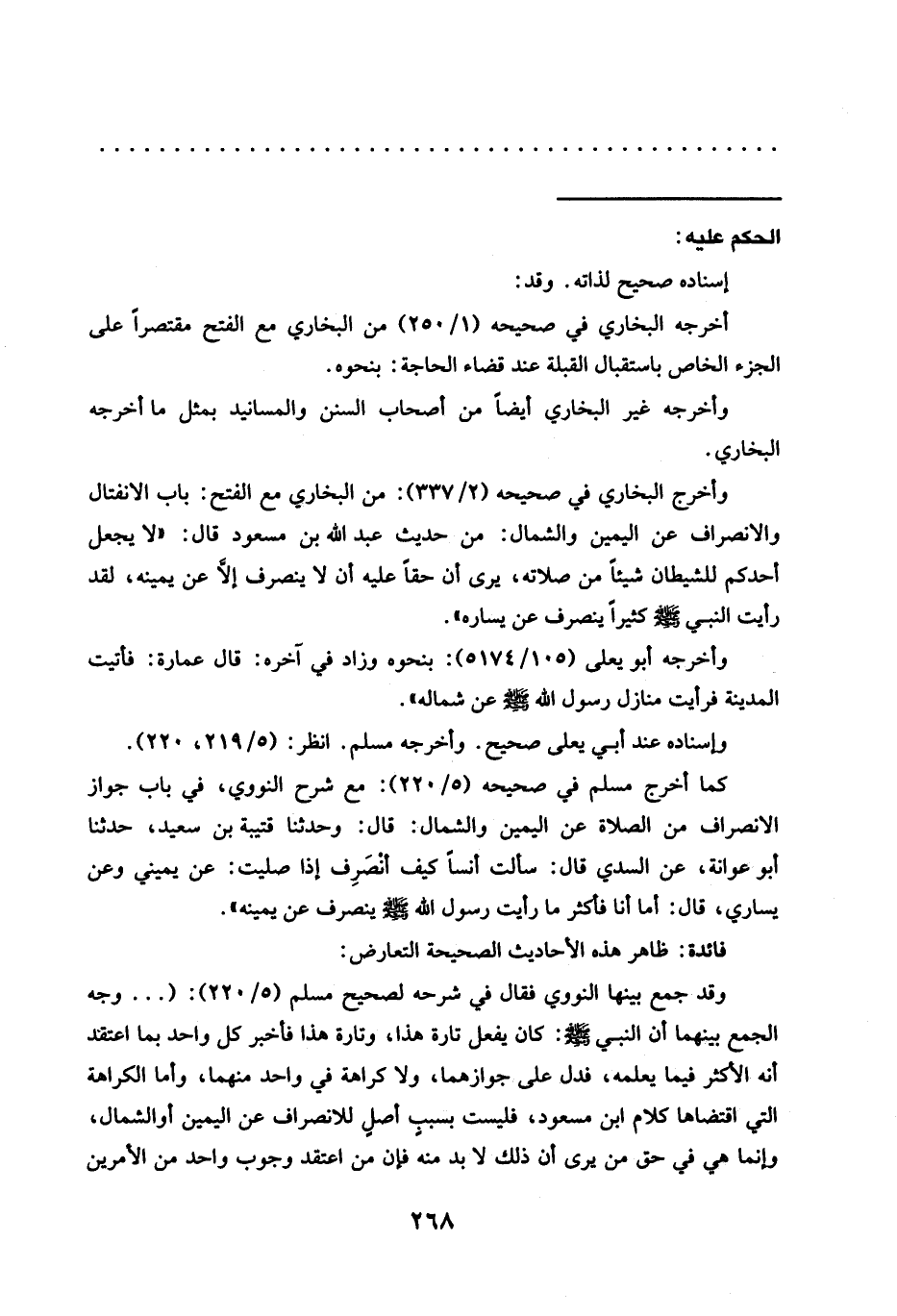 وقد جمع بينها النووي فقال في شرحه لصحيح مسلم (5/ 220): (... وجه الجمع بينهما أن النبي -صلى الله عليه وسلم-: كان يفعل تارة هذا، وتارة هذا فأخبر كل واحد بما اعتقد أنه الأكثر فيما يعلمه، فدل على جوازهما، ولا كراهة في واحد منهما، وأما الكراهة التي اقتضاها كلام ابن مسعود، فليست بسببِ أصلٍ للانصراف عن اليمين أوالشمال، وإنما هي في حق من يرى أن ذلك لا بد منه فإِن من اعتقد وجوب واحد من الأمرين=