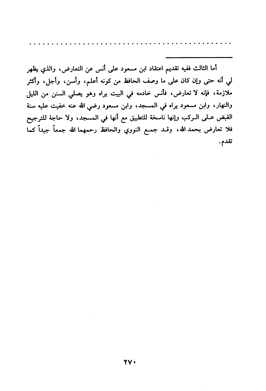 = أما الثالث ففيه تقديم اعتقاد ابن مسعود على أنس عن التعارض، والذي يظهر لي أنه حتى وإن كان على ما وصف الحافظ من كونه أعلم، وأسن، وأجل، وأكثر ملازمة، فإِنه لا تعارض، فأنس خادمه في البيت يراه وهو يصلي السنن من الليل والنهار، وابن مسعود يراه في المسجد، وابن مسعود رضي الله عنه خفيت عليه سنة القبض على الركب وإنها ناسخة للتطبيق مع أنها في المسجد، ولا حاجة للترجيح فلا تعارض بحمد الله، وقد جمع النووي والحافظ رحمهما الله جمعًا جيدًا كما تقدم.