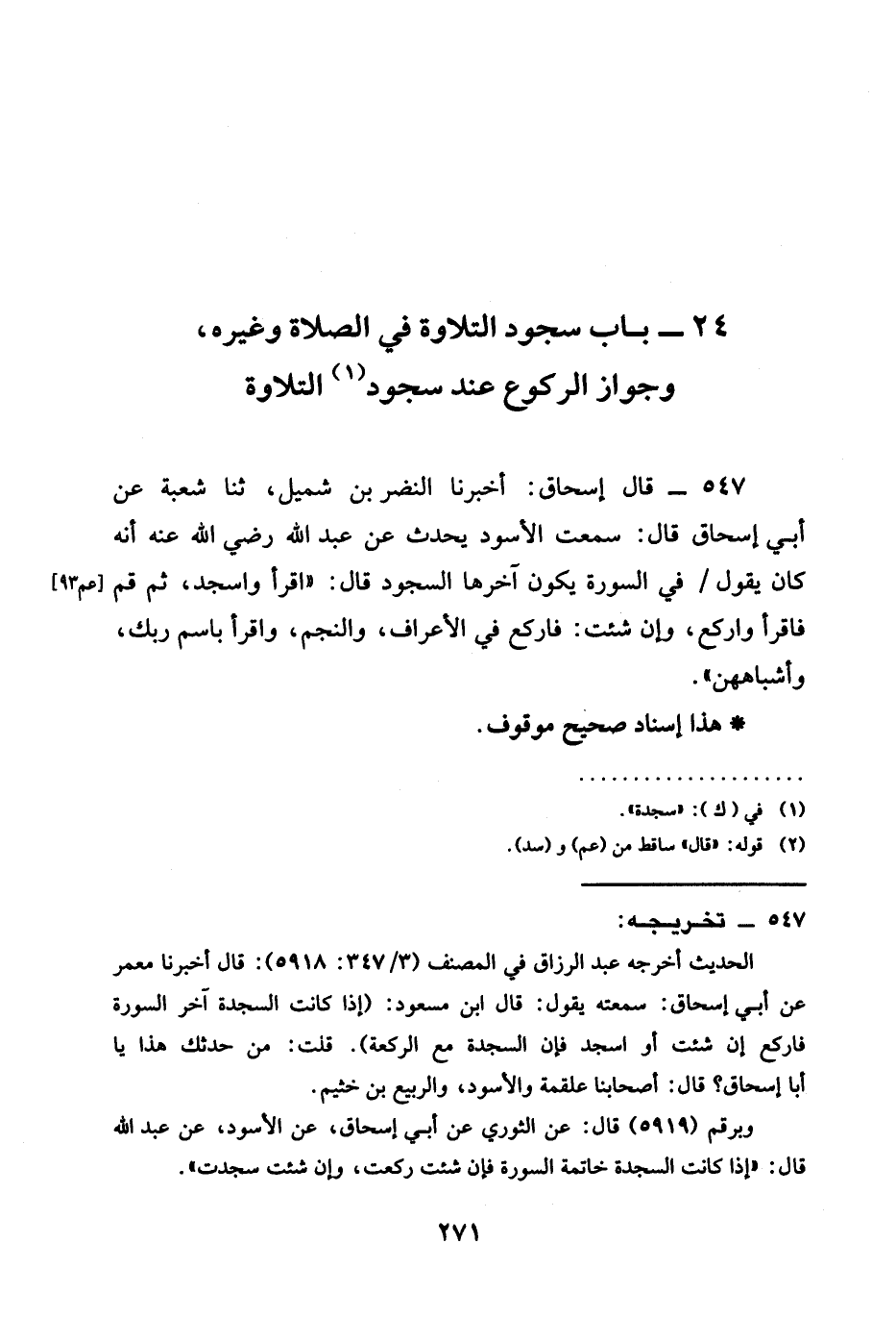 547 - قَالَ إِسْحَاقُ أَخْبَرَنَا النَّضْرُ بْنُ شُمَيْلٍ ثنا شُعْبَةُ عَنْ أبي إسحاق قال سَمِعْتُ الْأَسْوَدَ يُحَدِّثُ عَنْ عبد الله رضي الله عنه أَنَّهُ كَانَ يَقُولُ فِي §السُّورَةِ يَكُونُ آخِرَهَا السُّجُودُ قَالَ " اقْرَأْ وَاسْجُدْ ثُمَّ قُمْ فَاقْرَأْ وَارْكَعْ وَإِنْ شِئْتَ فَارْكَعْ فِي الْأَعْرَافِ وَالنَّجْمِ وَاقْرَأْ بِاسْمِ رَبِّكَ وَأَشْبَاهِهِنَّ "