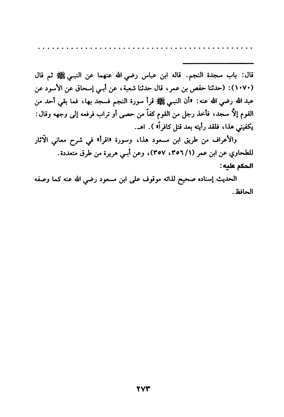 = قال: باب سجدة النجم. قاله ابن عباس رضي الله عنهما عن النَّبِيَّ -صَلَّى اللَّهُ عَلَيْهِ وَسَلَّمَ- ثُمَّ قَالَ (1070):) حدثنا حفص بن عمر، قال حدثنا شعبة، عن أبي إسحاق عن الأسود عَنْ عَبْدِ اللَّهِ رَضِيَ اللَّهُ عَنْهُ: "أَنَّ النَّبِيَّ -صَلَّى اللَّهُ عَلَيْهِ وَسَلَّمَ- قَرَأَ سورة النجم فسجد بها، فما بقي أحد من القوم إلَّا سجد، فأخذ رجل من القوم كفًا من حصى أو تراب فرفعه إلى وجهه وقال: يكفيني هذا، فلقد رأيته بعد قتل كافرًا"). اهـ.