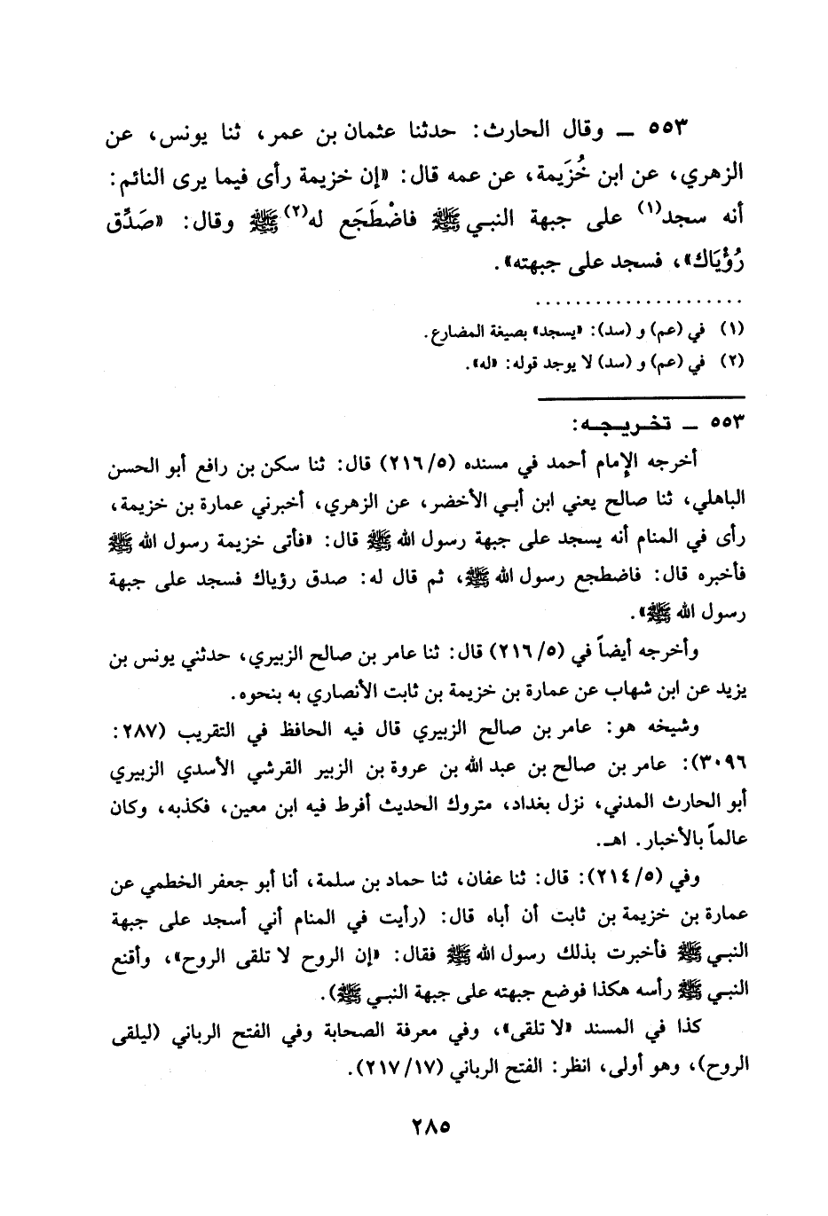 553 - وَقَالَ الْحَارِثُ حدثنا عُثْمَانُ بْنُ عُمَرَ ثنا يُونُسُ عَنِ الزُّهْرِيِّ عَنِ ابْنِ خُزَيْمَةَ عن عمه قال " أَنَّ خُزَيْمَةَ رَأَى فِيمَا يَرَى النَّائِمُ أَنَّهُ §سَجَدَ عَلَى جَبْهَةِ النَّبِيِّ صَلَّى اللَّهُ عَلَيْهِ وَسَلَّمَ فَاضْطَجَعَ لَهُ صَلَّى اللَّهُ عَلَيْهِ وَسَلَّمَ وَقَالَ " صَدِّقْ رُؤْيَاكَ " فَسَجَدَ عَلَى جَبْهَتِهِ