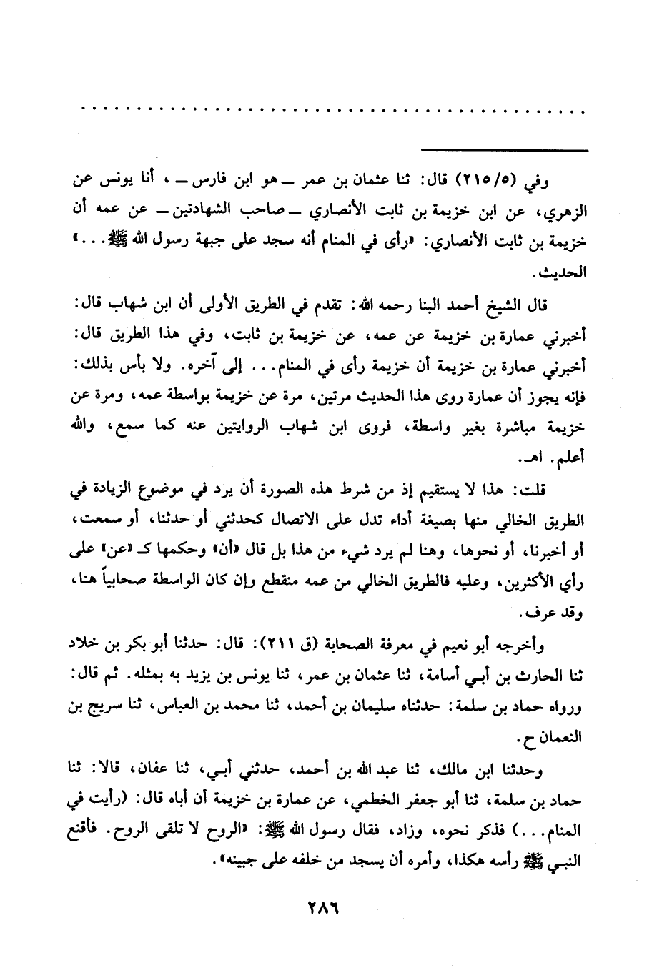 = وفي (5/ 215) قال: ثنا عثمان بن عمر-هو ابن فارس-، أنا يونس عن الزهري، عن ابن خزيمة بن ثابت الأنصاري -صاحب الشهادتين- عن عمه أن خزيمة بن ثابت الأنصاري: "رأى في المنام أنه سجد على جبهة رَسُولُ اللَّهِ -صَلَّى اللَّهُ عَلَيْهِ وَسَلَّمَ- ... " الْحَدِيثَ.