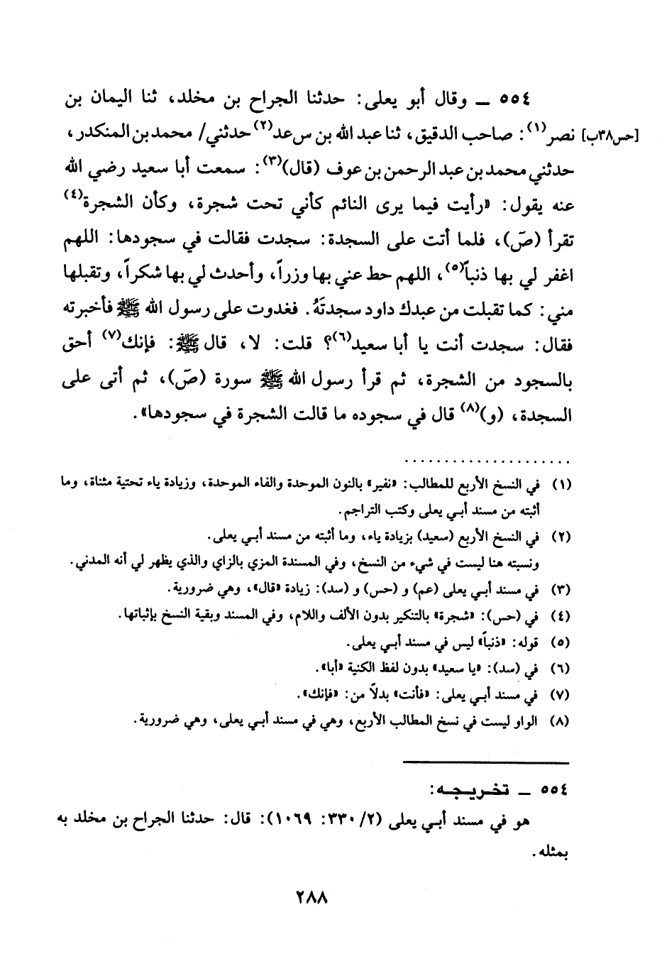 554 - وَقَالَ أَبُو يَعْلَى حَدَّثَنَا الْجَرَّاحُ بْنُ مَخْلَدٍ ثنا الْيَمَانُ بْنُ نَصْرٍ صَاحِبُ الدَّقِيقِ ثنا عَبْدُ اللَّهِ بْنُ سَعْدٍ حَدَّثَنِي مُحَمَّدُ بْنُ الْمُنْكَدِرِ حَدَّثَنِي مُحَمَّدُ بْنُ عَبْدِ الرَّحْمَنِ بن عوف قال سَمِعْتُ أبا سعيد رضي الله عنه يَقُولُ " رَأَيْتُ فِيمَا يَرَى النَّائِمُ كَأَنِّي تَحْتَ شَجَرَةٍ وَكَأَنَّ الشَّجَرَةَ تَقْرَأُ (ص) فَلَمَّا أَتَتْ عَلَى السَّجْدَةِ سَجَدَتْ فَقَالَتْ فِي سُجُودِهَا اللَّهُمَّ اغْفِرْ لِي بِهَا ذَنْبًا اللَّهُمَّ حُطَّ عَنِّي بِهَا وِزْرًا وَأَحْدِثْ لِي بِهَا شُكْرًا وَتَقَبَّلْهَا مِنِّي كَمَا تَقَبَّلْتَ مِنْ عَبْدِكَ دَاوُدَ سَجْدَتَهُ فَغَدَوْتُ عَلَى رَسُولِ اللَّهِ صَلَّى اللَّهُ عَلَيْهِ وَسَلَّمَ فَأَخْبَرْتُهُ فَقَالَ سَجَدْتَ أَنْتَ يَا أَبَا سَعِيدٍ قُلْتُ لَا قَالَ صَلَّى اللَّهُ عَلَيْهِ وَسَلَّمَ §فَإِنَّكَ أَحَقُّ بِالسُّجُودِ مِنَ الشَّجَرَةِ ثُمَّ قَرَأَ رَسُولُ اللَّهِ صَلَّى اللَّهُ عَلَيْهِ وَسَلَّمَ سُورَةَ (ص) ثُمَّ أَتَى على السجدة (و) قال فِي سُجُودِهِ مَا قَالَتِ الشَّجَرَةُ فِي سُجُودِهَا "