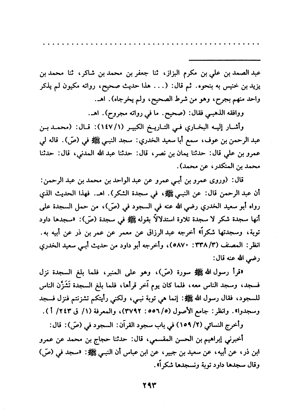 قال: (وروى عمرو بن أبي عمرو عن عبد الواحد بن محمد بن عبد الرحمن: أن عبد الرحمن قال: عَنِ النَّبِيِّ -صَلَّى اللَّهُ عَلَيْهِ وَسَلَّمَ-، فِي سجدة الشكر). اهـ. فهذا الحديث الذي رواه أبو سعيد الخدري رضي الله عنه في السجود في (ص)، من حمل السجدة على أنها سجدة شكر لا سجدة تلاوة استدلالًا بقوله -صلى الله عليه وسلم- في سجدة (ص): "سجدها داود توبة، وسجدتها شكرًا" أخرجه عبد الرزاق عن معمر عن عمر بن ذر عن أبيه به.