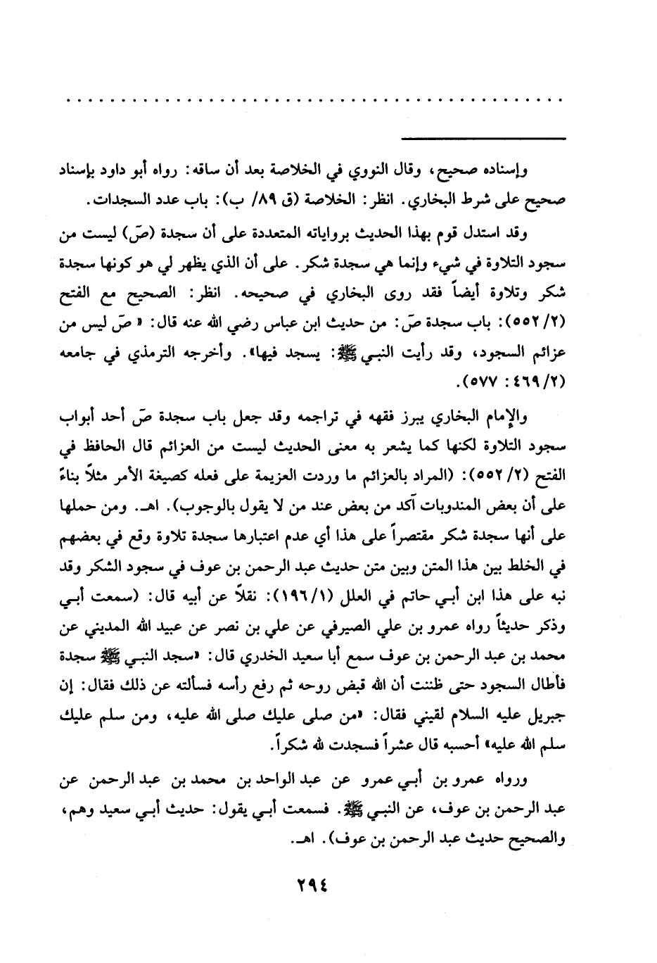 والإمام البخاري يبرز فقهه في تراجمه وقد جعل باب سجدة ص أحد أبواب سجود التلاوة لكنها كما يشعر به معنى الحديث ليست من العزائم قال الحافظ في الفتح (2/ 552): (المراد بالعزائم ما وردت العزيمة على فعله كصيغة الأمر مثلًا بناءً على أن بعض المندوبات آكد من بعض عند من لا يقول بالوجوب). اهـ. ومن حملها على أنها سجدة شكر مقتصرًا. على هذا أي عدم اعتبارها سجدة تلاوة وقع في بعضهم في الخلط بين هذا المتن وبين متن حديث عبد الرحمن بن عوف في سجود الشكر وقد نبه على هذا ابن أبي حاتم في العلل (1/ 196): نقلًا عن أبيه قال: (سمعت أبي وذكر حديثًا رواه عمرو بن علي الصيرفي عن علي بن نصر عن عبيد الله المديني عن محمد بن عبد الرحمن بن عوف سمع أبا سعيد الخدري قال: "سجد النبي -صلى الله عليه وسلم- سجدة فأطال السجود حتى ظننت أن الله قبض روحه ثم رفع رأسه فسألته عن ذلك فقال: إن جبريل عليه السلام لقيني فقال: "من صلى عليك صلى الله عليه، ومن سلم عليك سلم الله عليه" أحسبه قال عشرًا فسجدت لله شكرًا.