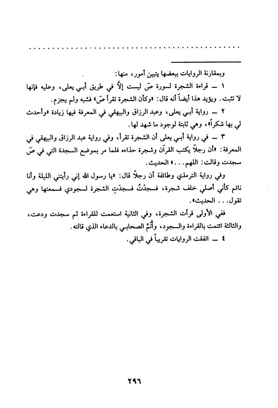 3 - في رواية أبي يعلى أن الشجرة تقرأ، وفي رواية عبد الرزاق والبيهقي في المعرفة: "أن رجلًا يكتب القرآن وشجرة حذاءه فلما مر بموضع السجدة التي في ص سجدت وقالت: اللهم ... " الحديث.