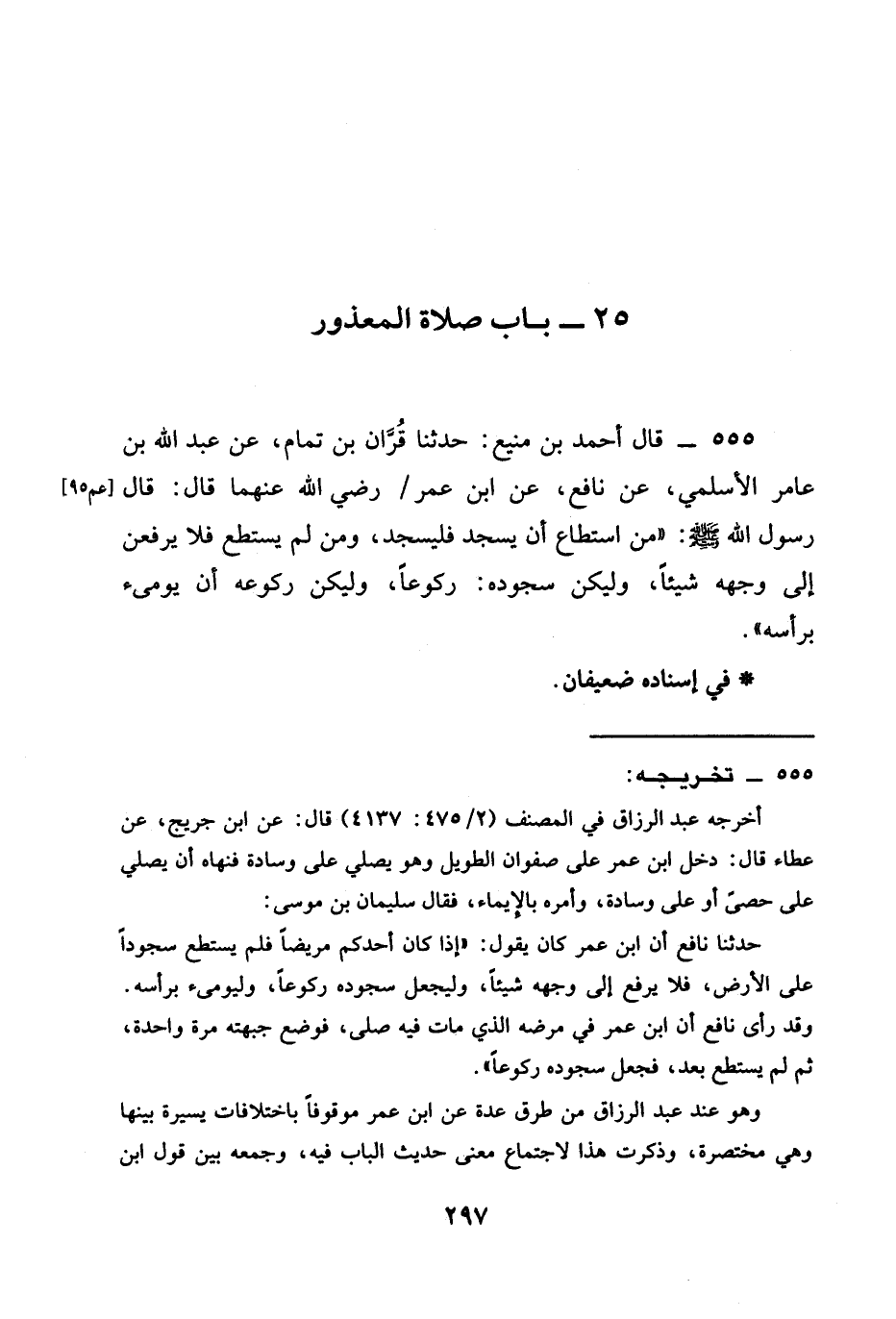 555 - قَالَ أَحْمَدُ بْنُ مَنِيعٍ حَدَّثَنَا قُرَّانُ بْنُ تَمَامٍ عَنْ عَبْدِ اللَّهِ بْنِ عَامِرٍ الْأَسْلَمِيِّ عَنْ نَافِعٍ عَنِ ابن عمر رضي الله عنهما قَالَ قَالَ رَسُولُ اللَّهِ صَلَّى اللَّهُ عَلَيْهِ وَسَلَّمَ " §مَنِ اسْتَطَاعَ أَنْ يَسْجُدَ فَلْيَسْجُدْ وَمَنْ لَمْ يَسْتَطِعْ فَلَا يَرْفَعَنَّ إِلَى وَجْهِهِ شَيْئًا وَلْيَكُنْ سُجُودُهُ رُكُوعًا وَلْيَكُنْ رُكُوعُهُ أَنْ يُومِئَ بِرَأْسِهِ "