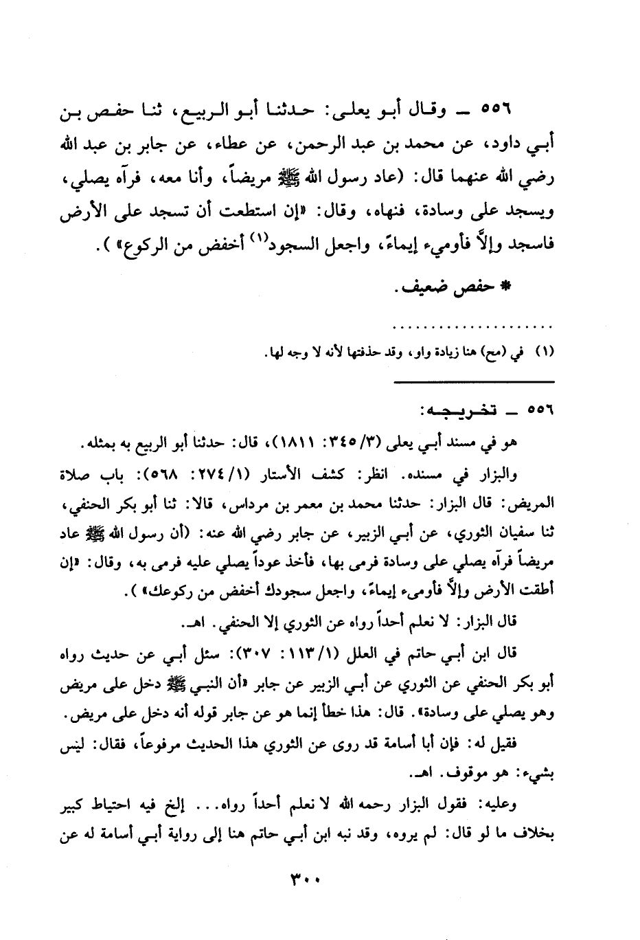 556 - وَقَالَ أَبُو يعلى حدثنا أبو الربيع ثنا حَفْصُ بْنُ أَبِي دَاوُدَ عَنْ مُحَمَّدِ بْنِ عَبْدِ الرَّحْمَنِ عَنْ عَطَاءٍ عَنْ جَابِرِ بْنِ عبد الله رضي الله عنهما قَالَ (عَادَ رَسُولُ اللَّهِ صَلَّى اللَّهُ عَلَيْهِ وَسَلَّمَ مَرِيضًا وَأَنَا مَعَهُ فَرَآهُ يُصَلِّي وَيَسْجُدُ عَلَى وِسَادَةٍ فَنَهَاهُ وَقَالَ " §إِنِ اسْتَطَعْتَ أَنْ تَسْجُدَ عَلَى الْأَرْضِ فَاسْجُدْ وَإِلَّا فأوميء إِيمَاءً وَاجْعَلِ السُّجُودَ أَخْفَضَ مِنَ الرُّكُوعِ