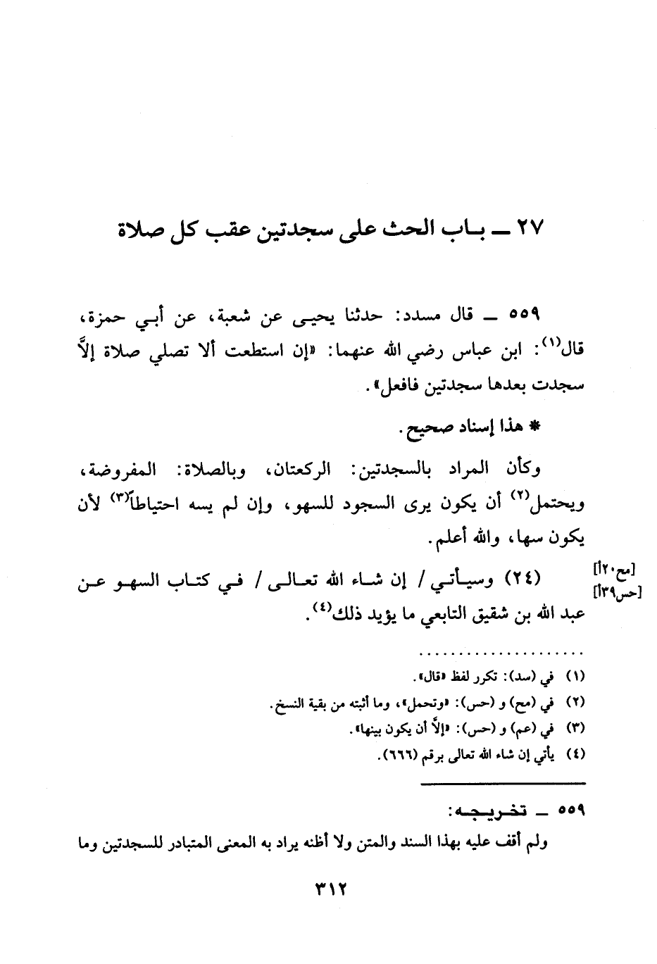 559 - قَالَ مُسَدَّدٌ حدثنا يَحْيَى عَنْ شُعْبَةَ عَنْ أَبِي حَمْزَةَ قَالَ ابْنُ عَبَّاسٍ رَضِيَ اللَّهُ عَنْهُمَا " إِنِ استطعت §ألا تُصَلِّيَ صَلَاةً إِلَّا سَجَدْتَ بَعْدَهَا سَجْدَتَيْنِ فَافْعَلْ "