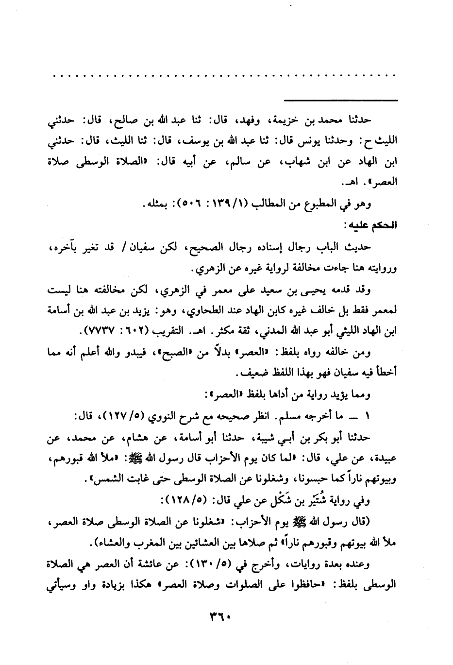 = حدثنا محمد بن خزيمة، وفهد، قال: ثنا عبد الله بن صالح، قال: حدثني الليث ح: وحدثنا يونس قال: ثنا عبد الله بن يوسف، قال: ثنا الليث، قال: حدثني ابن الهاد عن ابن شهاب، عن سالم، عن أبيه قال: "الصلاة الوسطى صلاة العصر". اهـ.