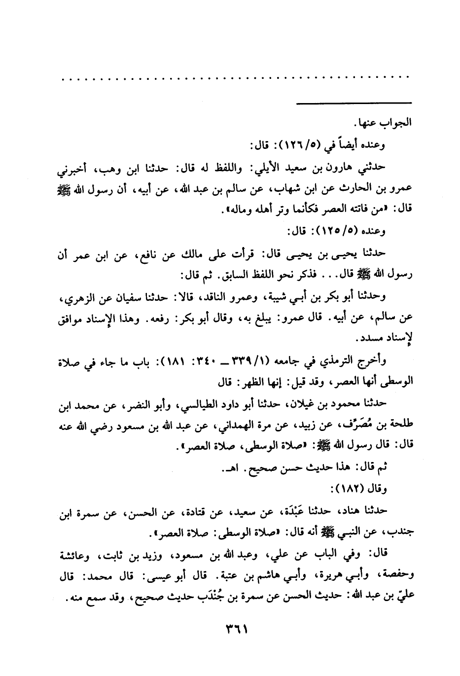وأخرج الترمذي في جامعه (1/ 339 - 340: 181): باب ما جاء في صلاة الوسطى أنها العصر، وقد قيل: إنها الظهر: قال