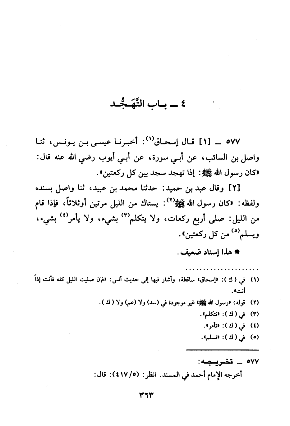 577 -[1] قَالَ إِسْحَاقُ أَخْبَرَنَا عِيسَى بْنُ يُونُسَ ثنا وَاصِلُ بْنُ السَّائِبِ عَنْ أَبِي سَوْرَةَ عَنْ أَبِي أَيُّوبَ رَضِيَ اللَّهُ عَنْهُ قَالَ " كَانَ رَسُولُ اللَّهِ صَلَّى اللَّهُ عَلَيْهِ وَسَلَّمَ §إِذَا تَهَجَّدَ سَجَدَ بَيْنَ كُلِّ رَكْعَتَيْنِ "