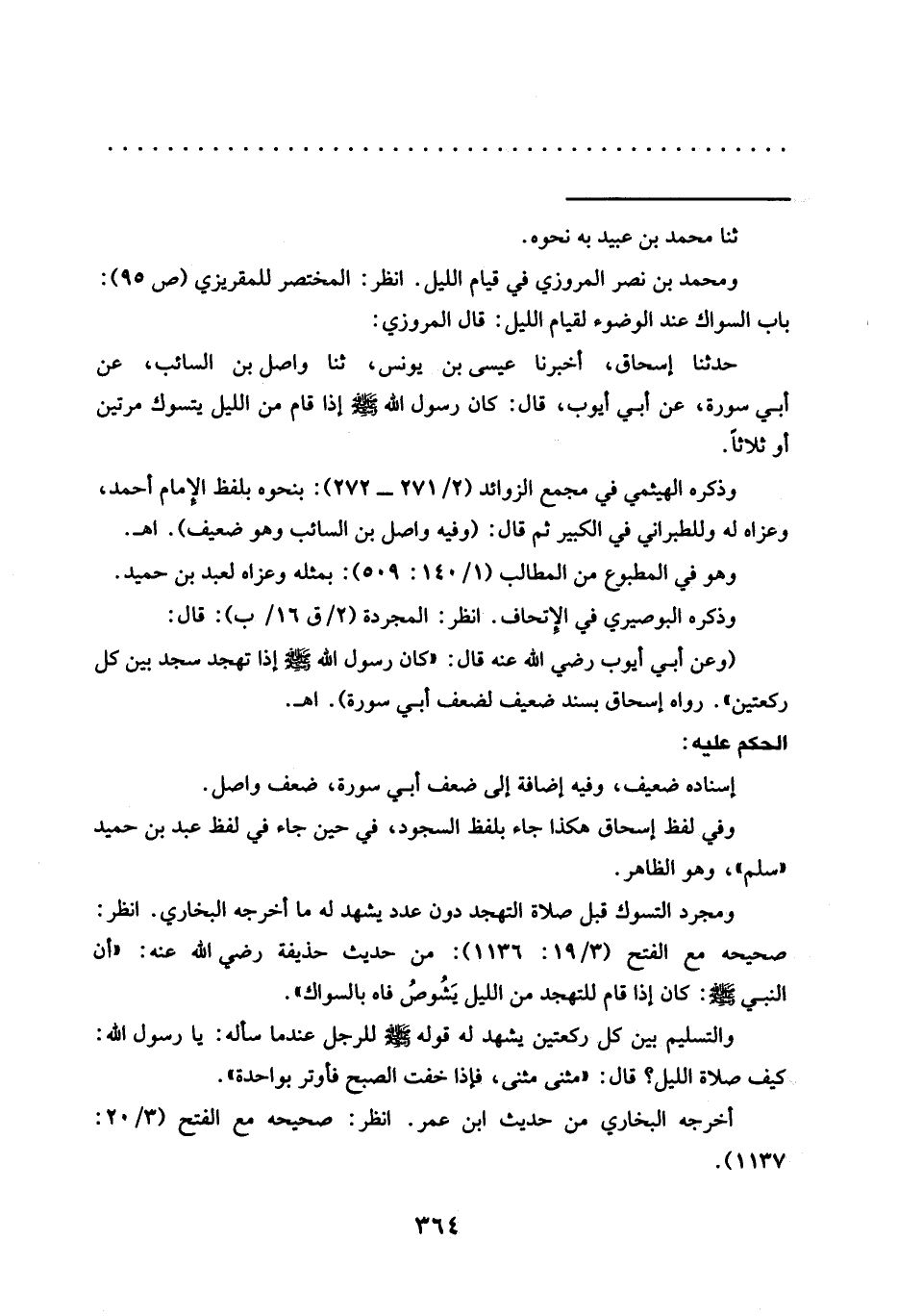 (وعن أَبِي أَيُّوبَ رَضِيَ اللَّهُ عَنْهُ قَالَ: "كَانَ رَسُولُ اللَّهِ -صلى الله عليه وسلم- إذا تهجد سجد بين كل ركعتين". رواه إسحاق بسند ضعيف لضعف أبي سورة). اهـ.