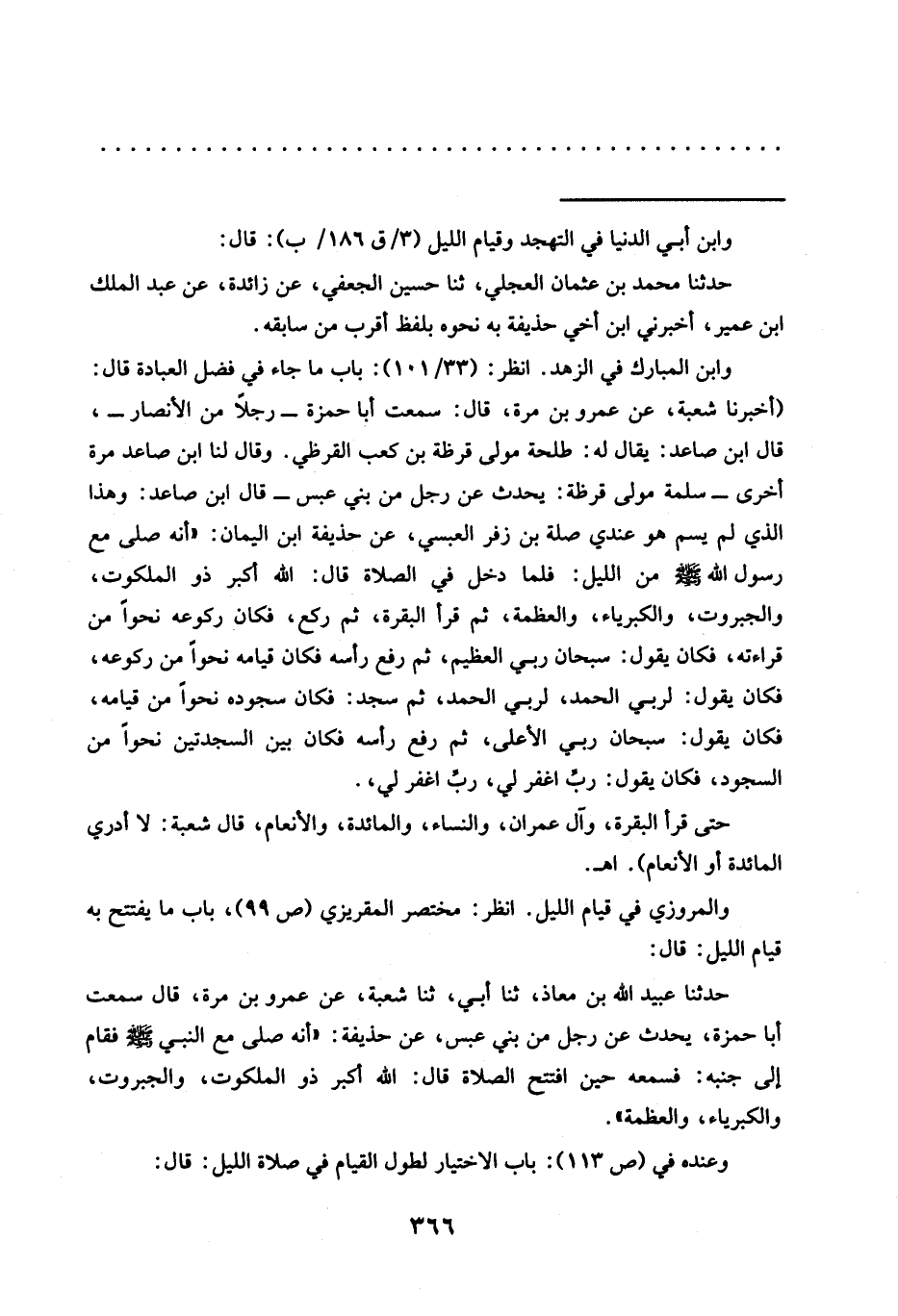 وابن المبارك في الزهد. انظر: (33/ 101): باب ما جاء في فضل العبادة قال: (أخبرنا شعبة، عن عمرو بن مرة، قال: سمعت أبا حمزة -رجلًا من الأنصار-، قال ابن صاعد: يقال له: طلحة مولى قرظة بن كعب القرظي. وقال لنا ابن صاعد مرة أخرى -سلمة مولى قرظة: يحدث عن رجل من بني عبس- قال ابن صاعد: وهذا الذي لم يسم هو عندي صلة بن زفر العبسي، عن حذيفة ابن اليمان: "أنه صلى مَعَ رَسُولِ اللَّهِ -صَلَّى اللَّهُ عَلَيْهِ وَسَلَّمَ- من الليل: فلما دخل في الصلاة قال: الله أكبر ذو الملكوت، والجبروت، والكبرياء، والعظمة، ثم قرأ البقرة، ثم ركع، فكان ركوعه نحوًا من قراءته، فكان يقول: سبحان ربي العظيم، ثم رفع رأسه فكان قيامه نحوًا من ركوعه، فكان يقول: لربي الحمد، لربي الحمد، ثم سجد: فكان سجوده نحوًا من قيامه، فكان يقول: سبحان ربي الأعلى، ثم رفع رأسه فكان بين السجدتين نحوًا من السجود، فكان يقول: رب اغفر لي، رب اغفر لي،.