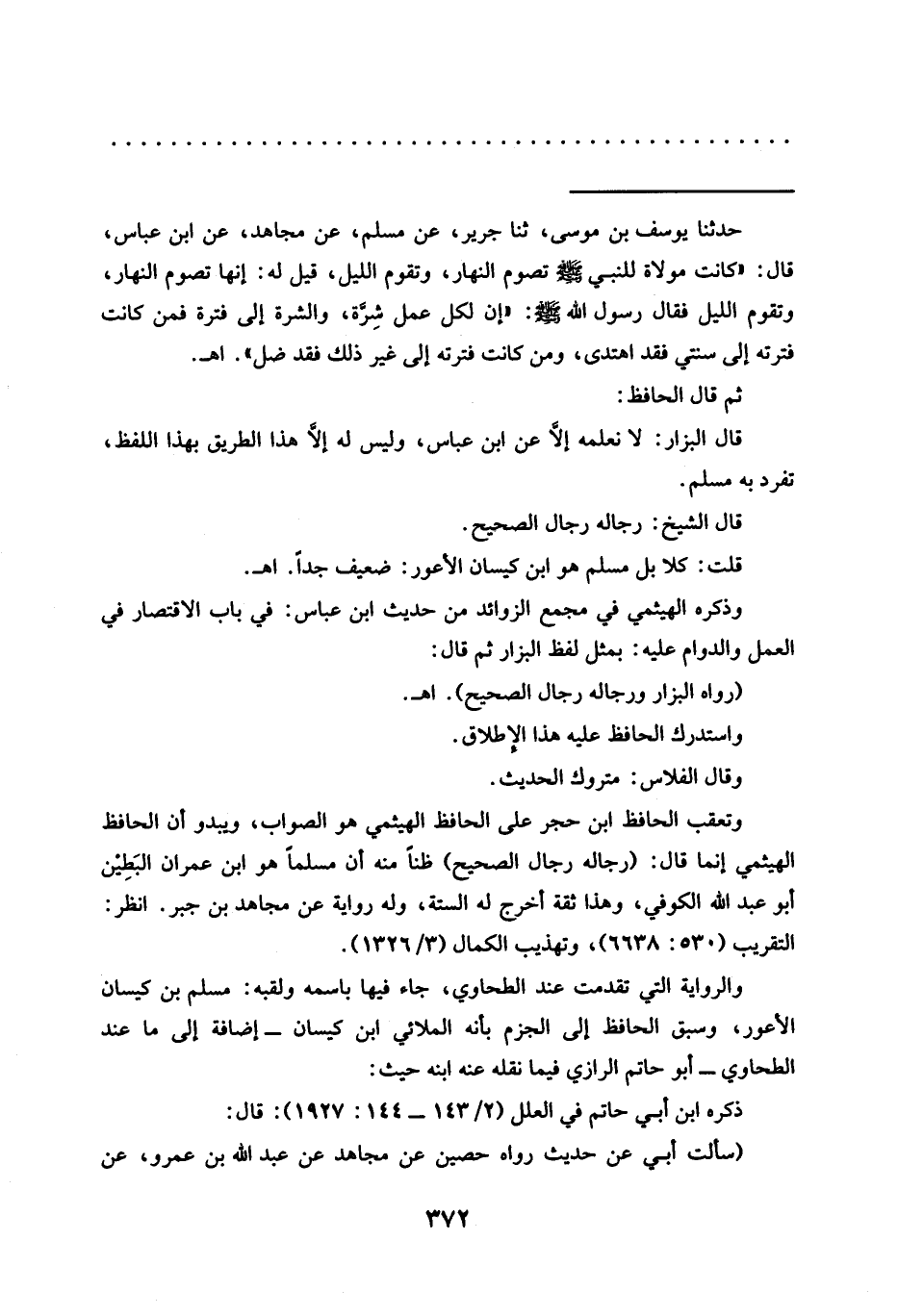 = حدثنا يوسف بن موسى، ثنا جَرِيرٌ، عَنْ مُسْلِمٍ، عَنْ مُجَاهِدٍ، عَنِ ابن عباس، قال: "كانت مولاة للنبي -صلى الله عليه وسلم- تصوم النهار، وتقوم الليل، قيل له: إنها تصوم النهار، وتقوم الليل فَقَالَ رَسُولُ اللَّهِ -صَلَّى اللَّهُ عَلَيْهِ وَسَلَّمَ-: "إن لكل عمل شِرَّة، والشرة إلى فترة فمن كانت فترته إلى سنتي نقد اهتدى، ومن كانت فترته إلى غير ذلك نقد ضل". اهـ.