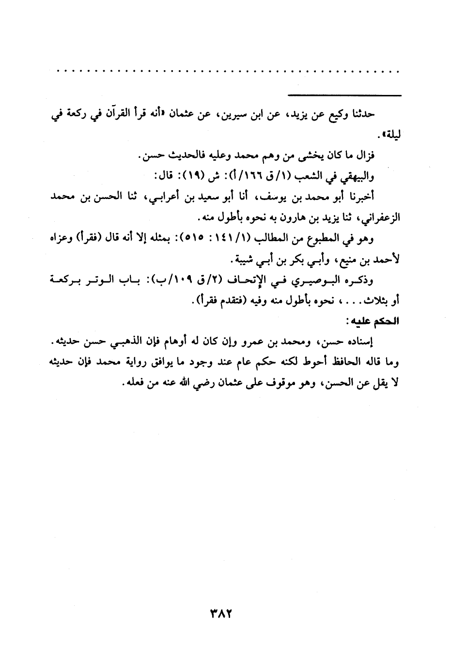 وما قاله الحافظ أحوط لكنه حكلم عام عند وجود ما يوافق رواية محمد فإِن حديثه لا يقل عن الحسن، وهو موقوف على عثمان رضي الله عنه من فعله.