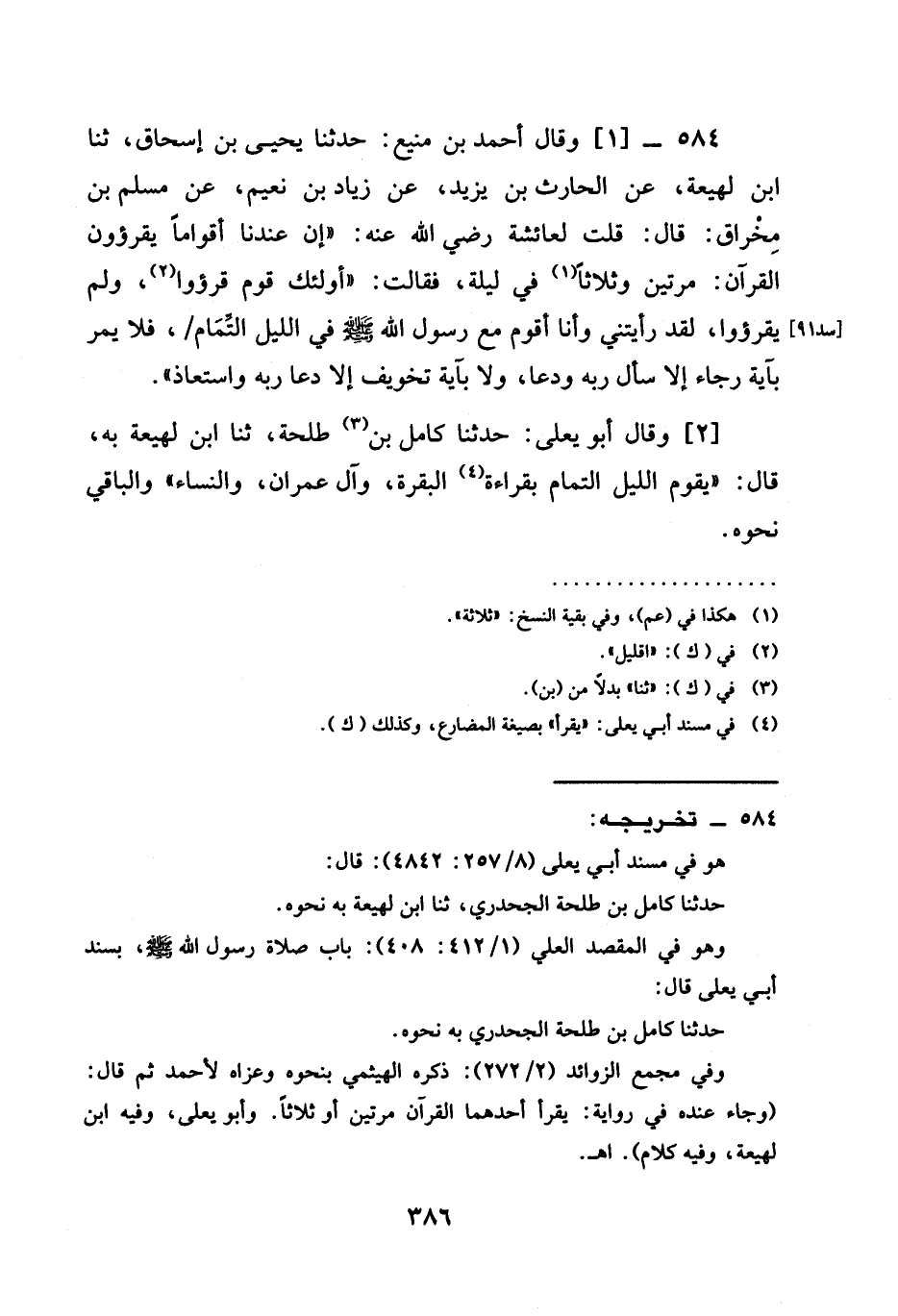 [2] وَقَالَ أَبُو يَعْلَى حَدَّثَنَا كَامِلُ بْنُ طَلْحَةَ ثنا ابْنُ لَهِيعَةَ بِهِ قَالَ " يَقُومُ اللَّيْلَ التَّمَامَ بِقِرَاءَةِ الْبَقَرَةِ وَآلَ عِمْرَانَ وَالنِّسَاءَ " وَالْبَاقِي نَحْوَهُ