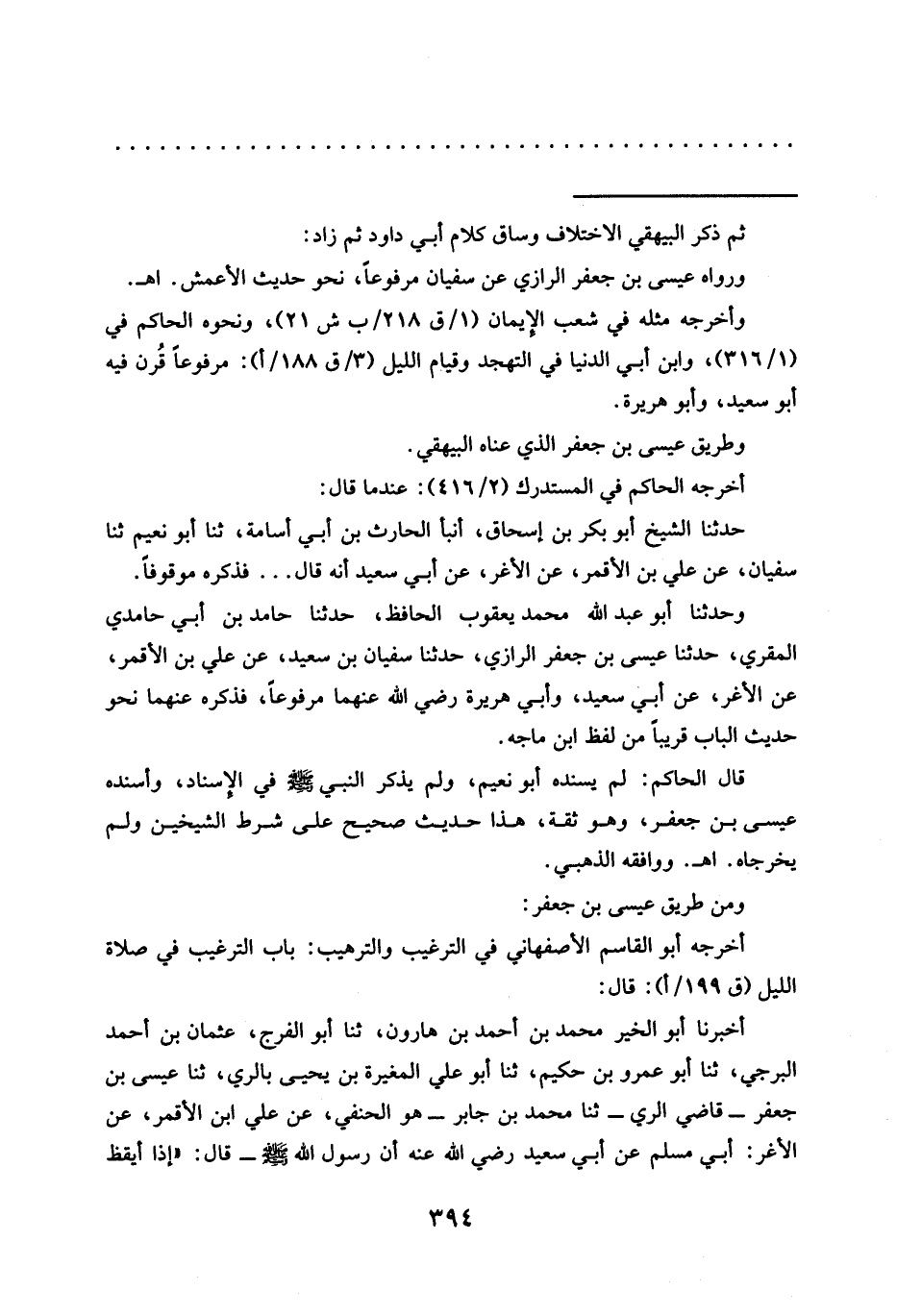 أخبرنا أبو الخير محمد بن أحمد بن هارون، ثنا أبو الفرج، عثمان بن أحمد البرجي، ثنا أبو عمرو بن حكيم، ثنا أبو علي المغيرة بن يحيى بالري، ثنا عيسى بن جعفر -قاضي الري- ثنا محمد بن جابر- هو الحنفي، عن علي ابن الأقمر، عن الأغر: أبي مسلم عن أبي سعيد رضي الله عنه أن رسول الله -صلى الله عليه وسلم- قال: "إذا أيقظ=