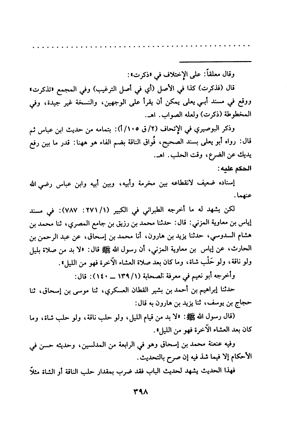 لكن يشهد له ما أخرجه الطبراني في الكبير (1/ 271: 787): في مسند إياس بن معاوية المزني: قال: حدثنا محمد بن رزيق بن جامع المصري، ثنا محمد بن هشام السدوسي، حَدَّثَنَا يَزِيدُ بْنُ هَارُونَ، أنا مُحَمَّدُ بْنُ إسحاق، عن عبد الرحمن بن الحارث، عن إياس بن معاوية المزني، أن رسول الله -صلى الله عليه وسلم- قال: "لا بد من صلاة بليل ولو ناقة، ولو حَلْب شاة، وما كان بعد صلاة العشاء الآخرة فهو من الليل".