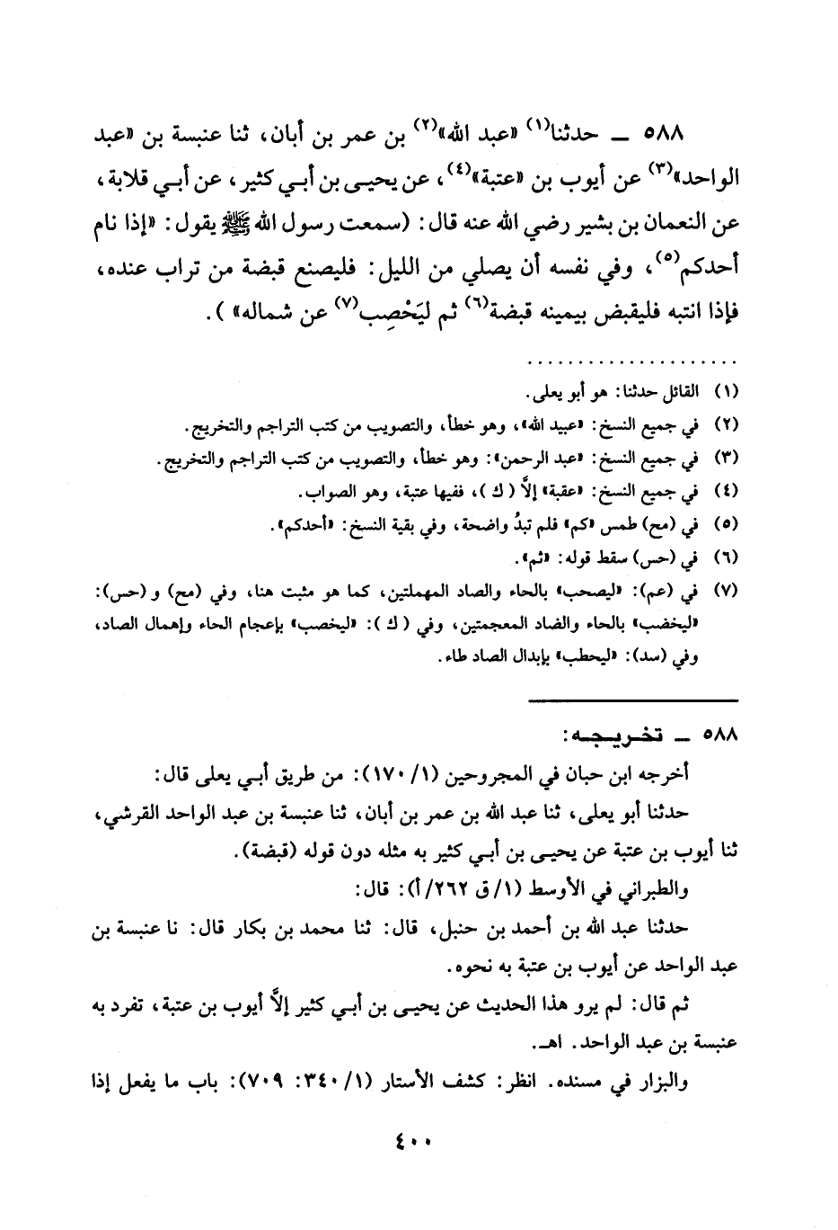 5880 - حَدَّثَنَا عَبْدُ اللَّهِ بْنُ عُمَرَ بْنِ أَبَانَ ثنا عَنْبَسَةُ بْنُ عَبْدِ الْوَاحِدِ عَنْ أَيُّوبَ بْنِ عُتْبَةَ عَنْ يَحْيَى بْنِ أَبِي كَثِيرٍ عَنْ أَبِي قِلَابَةَ عَنِ النُّعْمَانِ بْنِ بَشِيرٍ رَضِيَ اللَّهُ عَنْهُ قَالَ (سَمِعْتُ رَسُولَ اللَّهِ صَلَّى اللَّهُ عَلَيْهِ وَسَلَّمَ يَقُولُ " §إِذَا نَامَ أَحَدُكُمْ وَفِي نَفْسِهِ أَنْ يُصَلِّيَ مِنَ اللَّيْلِ فليصنع قَبْضَةً مِنْ تُرَابٍ عِنْدَهُ فَإِذَا انْتَبَهَ فَلْيَقْبِضْ بِيَمِينِهِ قَبْضَةً ثُمَّ لِيَحْصِبْ عَنْ شِمَالِهِ)