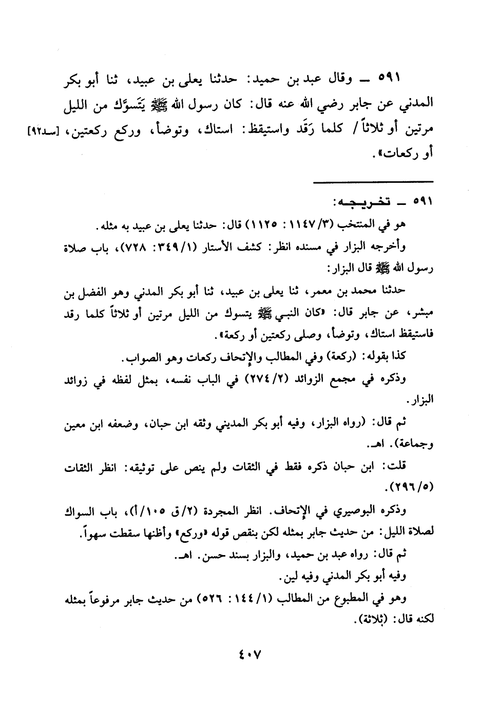 591 - وَقَالَ عَبْدُ بْنُ حُمَيْدٍ حَدَّثَنَا يَعْلَى بْنُ عُبَيْدٍ ثنا أَبُو بَكْرٍ الْمَدَنِيُّ عَنْ جَابِرٍ رَضِيَ اللَّهُ عَنْهُ قَالَ كَانَ رَسُولُ اللَّهِ صَلَّى اللَّهُ عَلَيْهِ وَسَلَّمَ §يَتَسَوَّكُ مِنَ اللَّيْلِ مَرَّتَيْنِ أَوْ ثَلَاثًا كُلَّمَا رَقَدَ وَاسْتَيْقَظَ اسْتَاكَ وَتَوَضَّأَ وَرَكَعَ رَكْعَتَيْنِ أَوْ رَكَعَاتٍ "