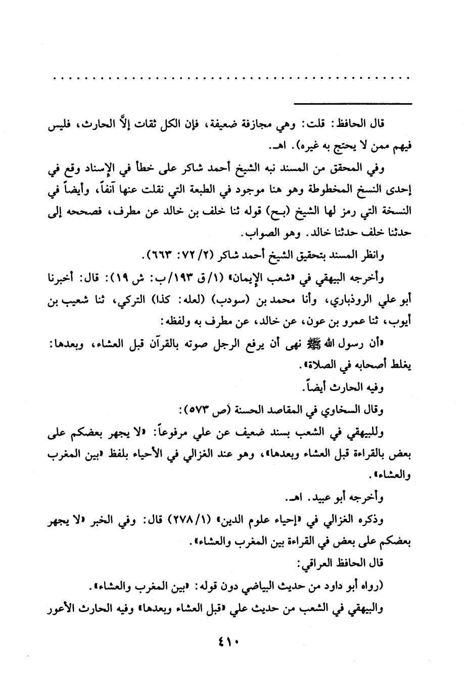 وللبيهقي في الشعب بسند ضعيف عن علي مرفوعًا: "لايجهر بعضكم على بعض بالقراءة قبل العشاء وبعدها"، وهو عند الغزالي في الأحياء بلفظ "بين المغرب والعشاء".