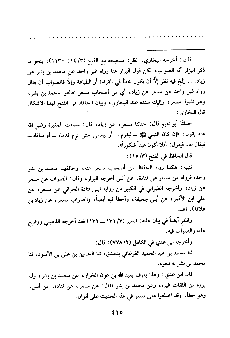 تنبيه: هكذا رواه الحفاظ من أصحاب مسعر عنه، وخالفهم محمد بن بشر وحده فرواه عن مسعر عن قتادة، عن أنس أخرجه البزار، وقال: الصواب عن مسعر عن زياد، وأخرجه الطبراني في الكبير من رواية أبي قتادة الحراني عن مسعر، عن علي ابن الأقمر، عن أبي جحيفة، وأخطأ فيه أيضًا، والصواب مسعر، عن زياد بن علاقة). اهـ.