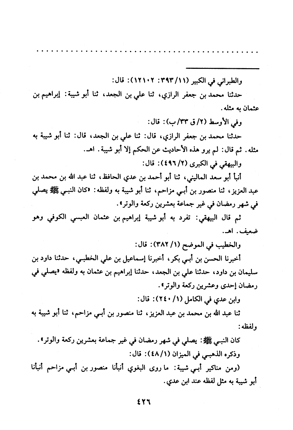 أخبرنا الحسن بن أبي بكر، أخبرنا إسماعيل بن علي الخطبي، حدثنا داود بن سليمان بن داود، حدثنا علي بن الجعد، حدثنا إبراهيم بن عثمان به ولفظه (يصلي في رمضان إحدى وعشرين ركعة والوتر".